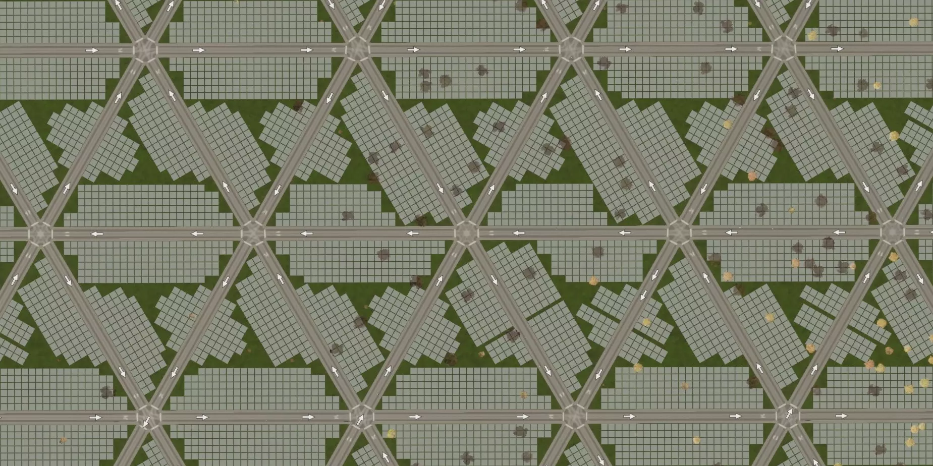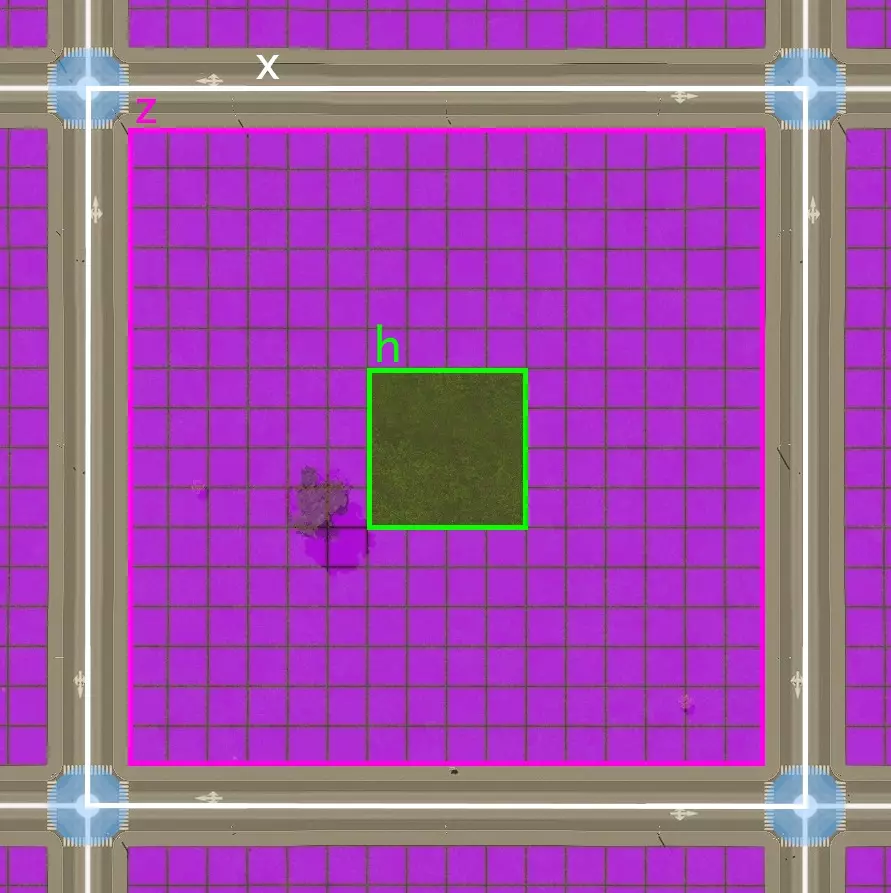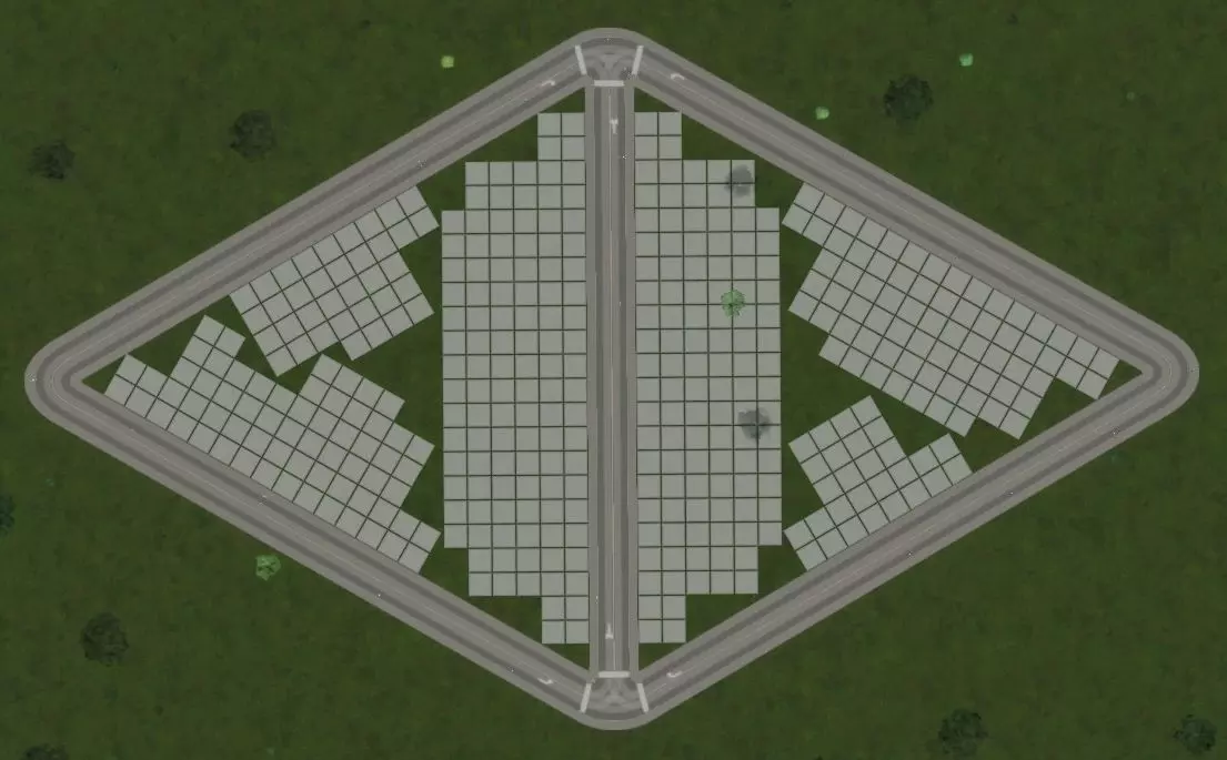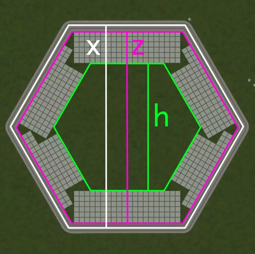 首先,我们来定义一些变量: x 是道路工具显示的街区一侧道路长度 z 是可分区临街面长度 h 是分区中间空白区域的边长 W 是所使用道路的宽度 先不考虑过于严谨的数学计算:为简单起见,下文将假设 x > z > h ≥ 0。可以通过诸如 h = max(0, z - 96m) 这样的方式来修正,但这会导致导数不再连续,处理起来比较麻烦。我们要找的最大值实际上位于参数空间中较为方便计算的部分。这并不意外,因为 z < 96m 只会意味着更高的道路与分区面积比,而不会在其他方面带来补偿性的增益。使用此方法,每个街区的可分区面积为街区内部空间(z²)减去距离道路过远的部分(h²)。但这两者都与街区长度直接相关,因为临街面是街区尺寸减去道路宽度(z = x - W),而“空洞”部分则是临街面减去分区延伸的距离(h = z - 2×6×8米 = x - W - 96米)。 我们试图优化的密度公式为: (z² - h²) / x² = ((x - W)² - (x - W - 96)²) / x² = 192×(x - W + 48) / x² 如何最大化这个密度呢?用微积分!导数为零处取得最大值: 0 = d/dx [192×(x - W + 48m)] / x² 0 = d/dx (x - W + 48m) / x² 0 = (2W - x + 96) / x³ 0 = 2W - x + 96 x = 2W + 96m 将结果代入之前的孔洞公式,会得到有趣的简化: h = x - W - 96m h = 2W + 96m - W - 96m h = (2W - W) + (96m - 96m) h = W 换句话说,要构建最优正方形网格,中间应留出与所用道路尺寸相同的孔洞。 我们来看小型道路的情况: 区块尺寸 密度 所需道路 112米(14单位) 36/49≈73.5% 28/9≈3.11米/单元格 128米(16单位) 3/4=75% 8/3≈2.67米/单元格 144米(18单位) 20/27≈74.1% 12/5=240米/单元格 使用16米宽的道路时,通过采用优化的方形网格,与中间有空白区域的方形网格相比,在相同区域内可获得约2%的额外分区单元格,同时道路成本(包括前期建设和维护费用)降低约14%。 虽然2%听起来可能不多,但要记住,密度对所有具有服务区的设施都有帮助。例如,如果你放置一个“1公里范围内+4幸福感”的标志性建筑,更高的密度意味着它可以为更多建筑提供该加成。 最终结论 因此,最佳方形网格的街区尺寸为: - 对于8米宽的小型道路(如 gravel road),街区尺寸为112米,密度为6/7≈85.7% - 对于16米宽的小型道路(如双车道公路),街区尺寸为128米,密度为3/4=75% - 对于24米宽的中型道路(如四车道公路),街区尺寸为144米,密度为2/3≈66%大型道路(如六车道道路,宽度32米)为160米,密度为3/5=60% 超大型道路(如八车道道路,宽度40米)为176米,密度为6/11≈54.6%