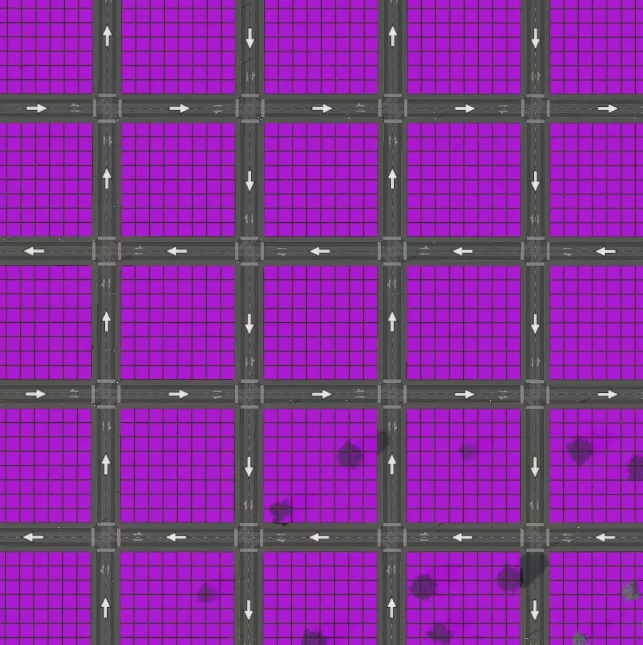 如果你觉得需要更多车道,可以考虑使用由小型单行道组成的网格。例如,使用双向两车道单行道的80米网格(如右侧所示),其密度为64%,虽然不是最优,但比大型道路网格的60%密度要好。而且其交通状况可能也更好,因为单行道交叉路口的冲突点比双向道路少得多。 为什么会有宽马路 中型和大型道路的用途是作为集散道和主干道,而非用于分区。较高的通行能力和较高的速度是为那些需要长距离出行的人准备的。这类道路在以下情况下效果最佳: 没有车道出入口:交通速度足够高,人们在驶离时不应判断是否有足够空间并入。而且你不希望人们被那些减速送货的卡车(或者减速收垃圾的垃圾车等)挡住去路。 禁止不受控左转:无论是从支路还是主路,道路都非常繁忙,等待车流间隙是不现实的。这意味着任何左转都需要交通信号灯或环岛,也就是说,没有这些设施的路口,所有左转都不允许。同样,在宽阔道路上直行也只能在有信号灯或环岛的情况下进行。不过更好的做法是不在宽阔道路上设置直行通道,只保留T型路口——或许甚至可以采用连续绿灯T型交叉口。 减少交叉路口:小路可以有很多交叉路口,方便你到达各个地方。宽阔的道路在交叉路口之间应留有足够的空间,这样车辆才能充分加速,以适应较高的限速。想想看,当你开车时每100米就遇到一个红灯,那有多烦人。额外的空间还能让车辆在需要时拥有足够的变道空间。 你会发现,所有这些问题同样适用于手动放置的建筑。宽阔道路上唯一合理的建筑是那些车流量非常低或具有高度紧急性的建筑,而这类建筑非常少。无线电桅杆是可以的(1个工作岗位),变电站(甚至不需要道路),或许还有消防站(8个工作岗位,但消防车的交通很重要)。但例如,消防局会产生来自60个工作岗位的交通流量,警察局则有低优先级的监狱交通流量等。 实际上,在很多这类情况下,你可以考虑只使用双向高速公路(或许可以加上声屏障)。这样你就不能在上面进行分区规划,这也有助于避免分区网格因额外的道路而产生混乱。只要记得仍需提供良好的步行连接,这样人们就不会被迫开车出行。在《城市:天际线2》中,目前为止最好的公共交通方式就是步行。 矩形网格 遗憾的是,并没有唯一真正的矩形网格。从技术角度而言,使用越来越长的矩形区域确实能不断提高密度(渐近式增长)。例如,使用小型道路时,你可以达到85%的密度,但这需要一个112×1920米的网格。这相当于一个超过3格长的区块,在我看来这实在是太夸张了。 因此,我们换个思路,先来看看哪些使用小型道路的矩形网格,其密度至少能达到最佳正方形网格的水平(75%,橙色标注),或者能达到80%(紫色标注)。