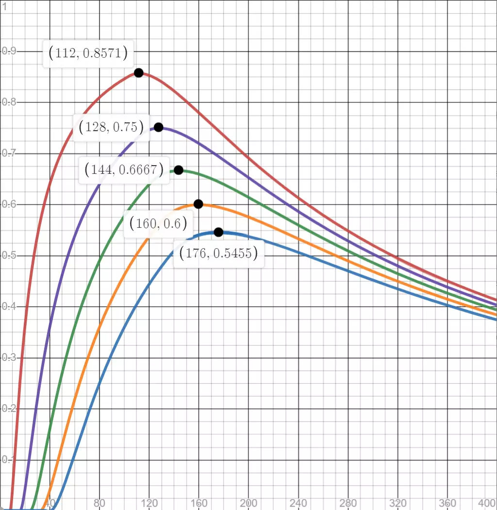 更宽道路的代价 上一部分包含大量数学计算。虽然这对于找到最优解很有帮助,但从中获得直观理解可能比较困难。 以下是方形网格使用不同宽度道路时的密度结果图表:8米(红色)、16米(紫色)、24米(绿色)、32米(橙色)和40米(蓝色)。
