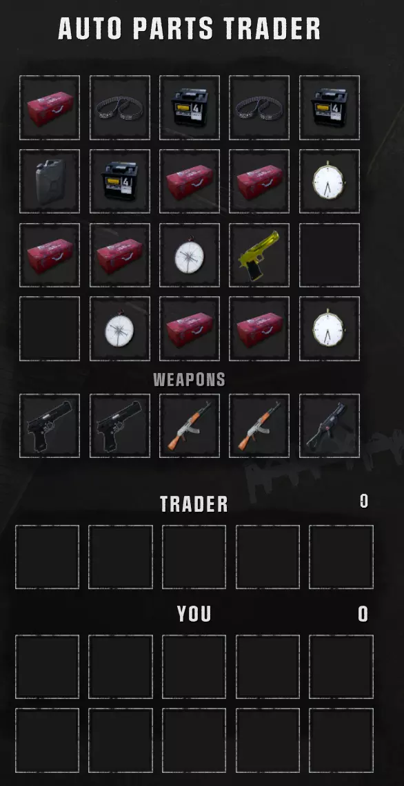 如果通话成功,你会收到语音反馈消息。 通话成功或失败后,指示灯会变为红色,表示交易商通话功能已禁用(直到再次变为绿色)。 通话成功后,交易商很快会出现。你可能需要到基地围墙后面寻找他,因为他通常会在前往CB无线电桌的路上卡住。 他会在同一位置停留一段时间后离开。 交易商类型 有多种类型的交易商,每种类型提供不同的物品: 汽车零件交易商 服装交易商 综合交易商 ...价格 不同商人的价格可能有所不同——我没有在多次游戏中测试过。 我发现最适合出售的物品: 手表/指南针 任何你不需要且占用宝贵背包空间的多余武器(主要是步枪、手枪),价格范围在50到200多不等(步枪价格更高),所以记得收集那些你不打算使用的手枪和霰弹枪…… 防毒面具——保留几个用于需要面具的地图区域,但任何多余的面具都能卖出不错的价格——200 望远镜可以卖个好价钱——85 商人商品 不确定不同商人或不同游戏之间的价格是否一致,但这是我在游戏中发现的情况。 从汽车零件商人那里你可以买到: - 风扇皮带和起动机,价格为200