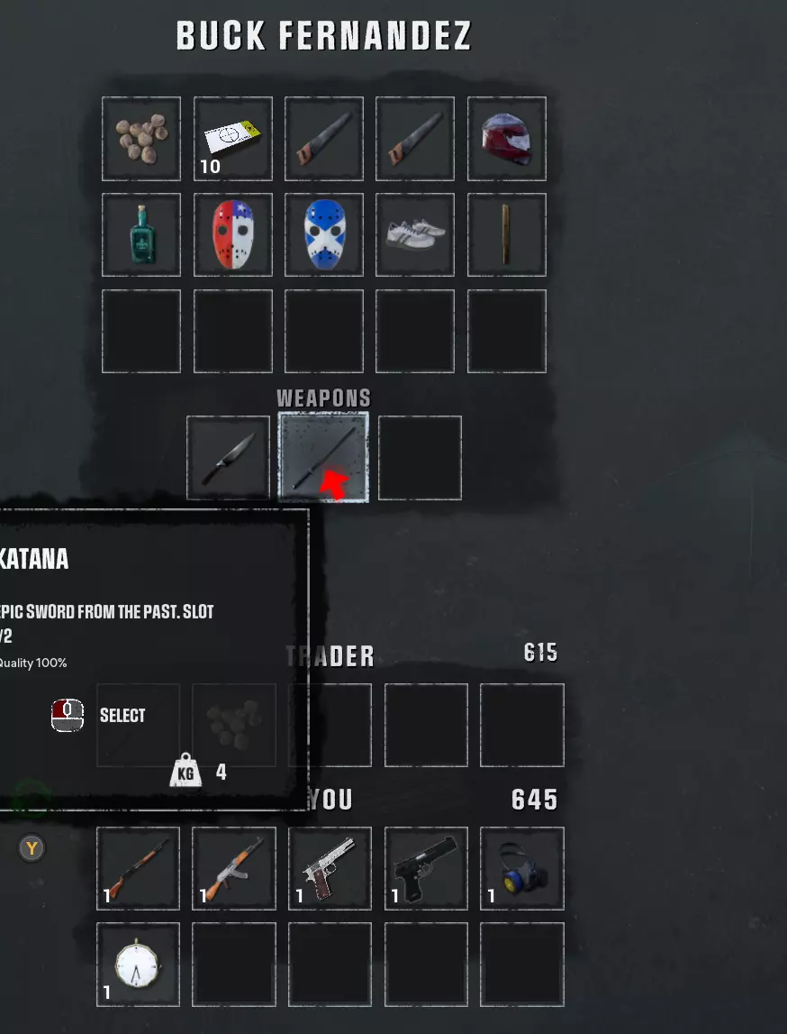 巴克·费尔南德斯每次的物品栏都不同,能携带武士刀、剑、带锯片的棍子等独特物品,有时会直接冲向僵尸然后死亡……