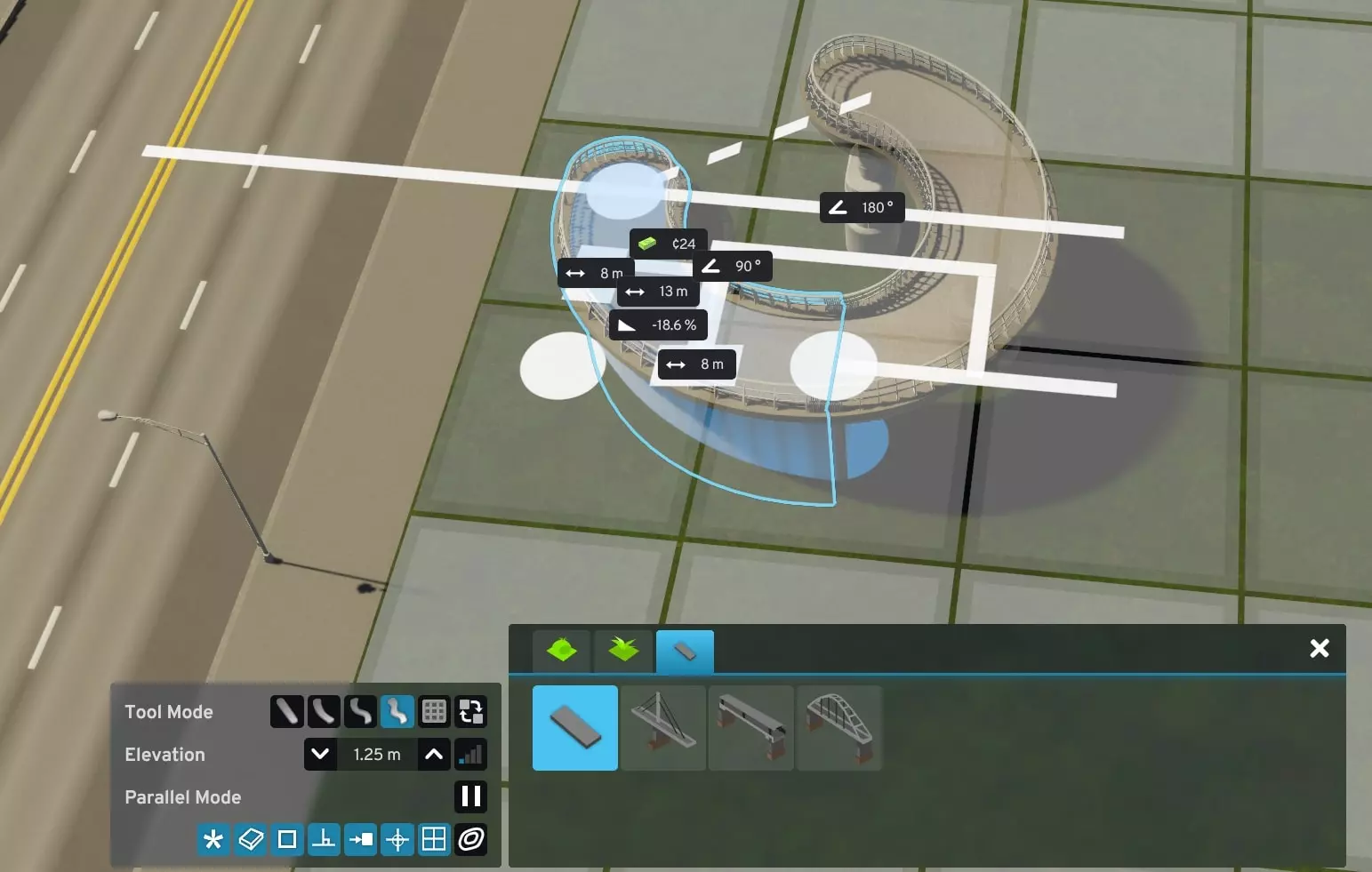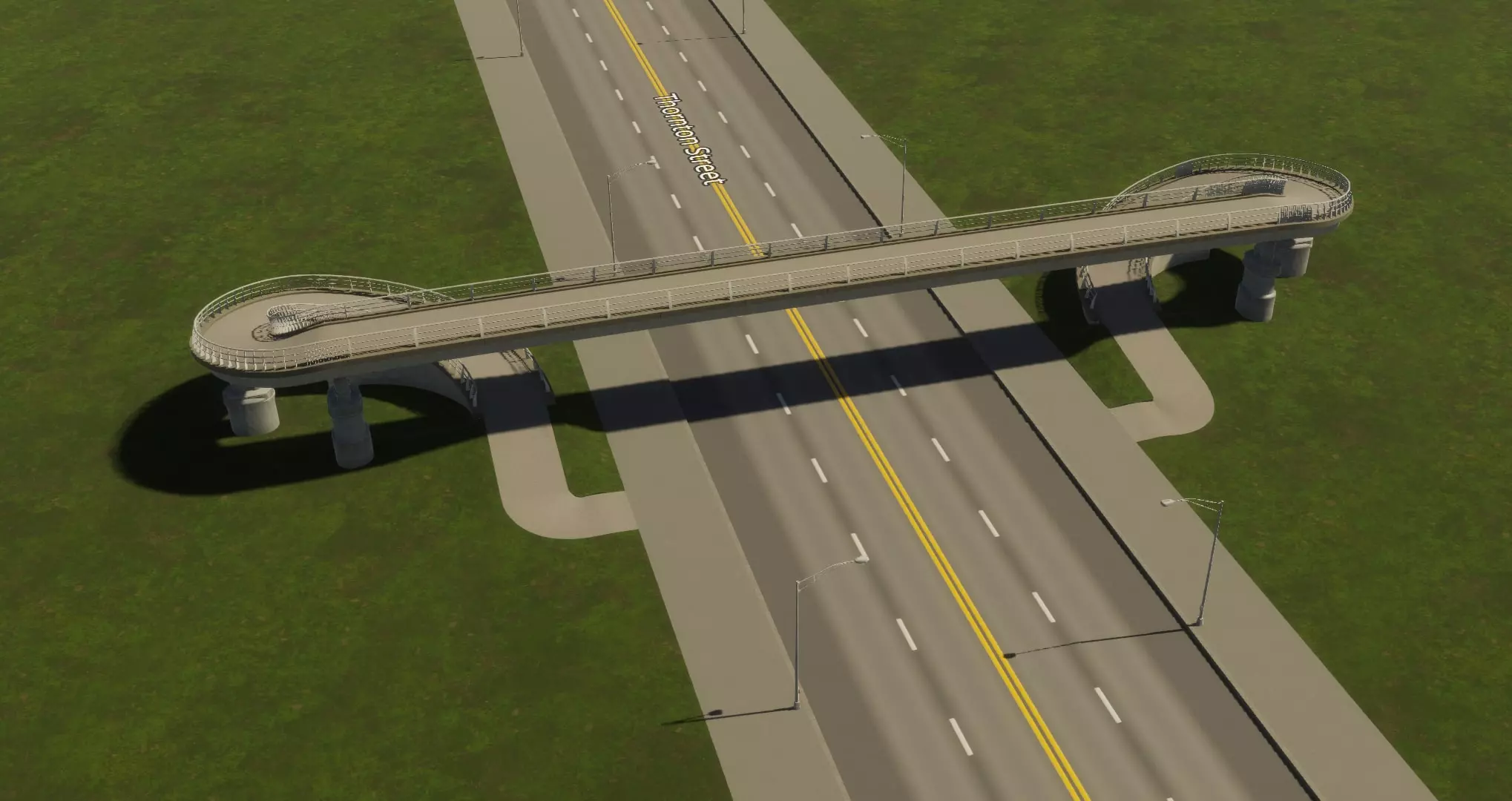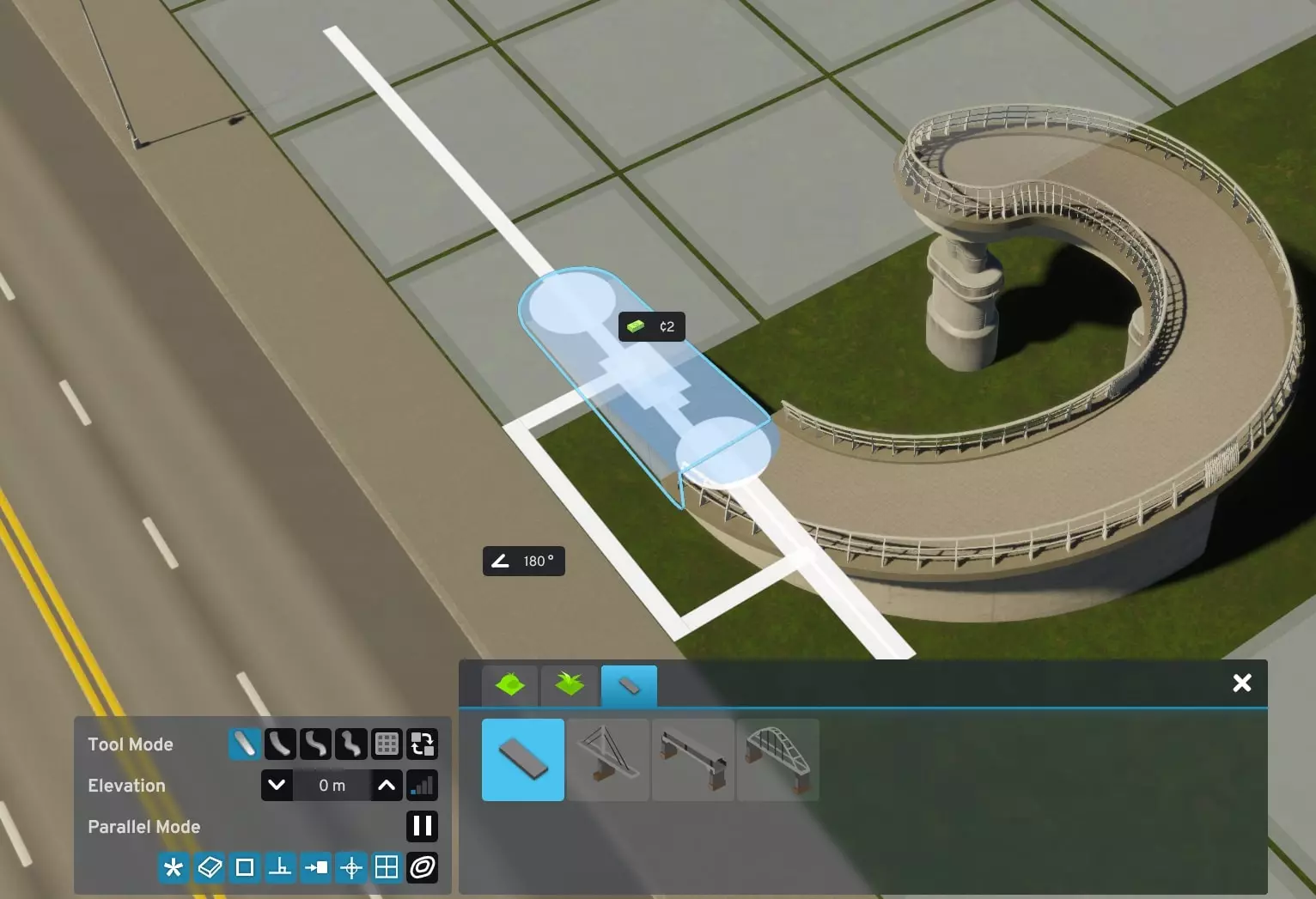 如果你遇到过这种情况,我或许有个解决办法。受Reddit用户LyrukoF发布的一个酷炫环形坡道帖子启发,我开始模仿他们的设计。在这个过程中,我还弄明白了如何让市民真正使用它。 建造桥梁 主要难点在于: 1. 确保它能实际建造出来 2. 附近有额外的交叉通行选项(这很糟糕) 3. 保持自己的理智 从你的主干道开始。我选择了一条简单的四车道主干道。