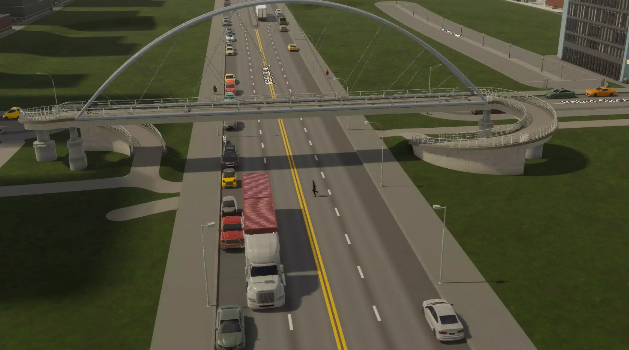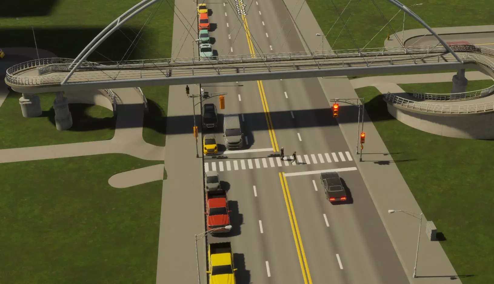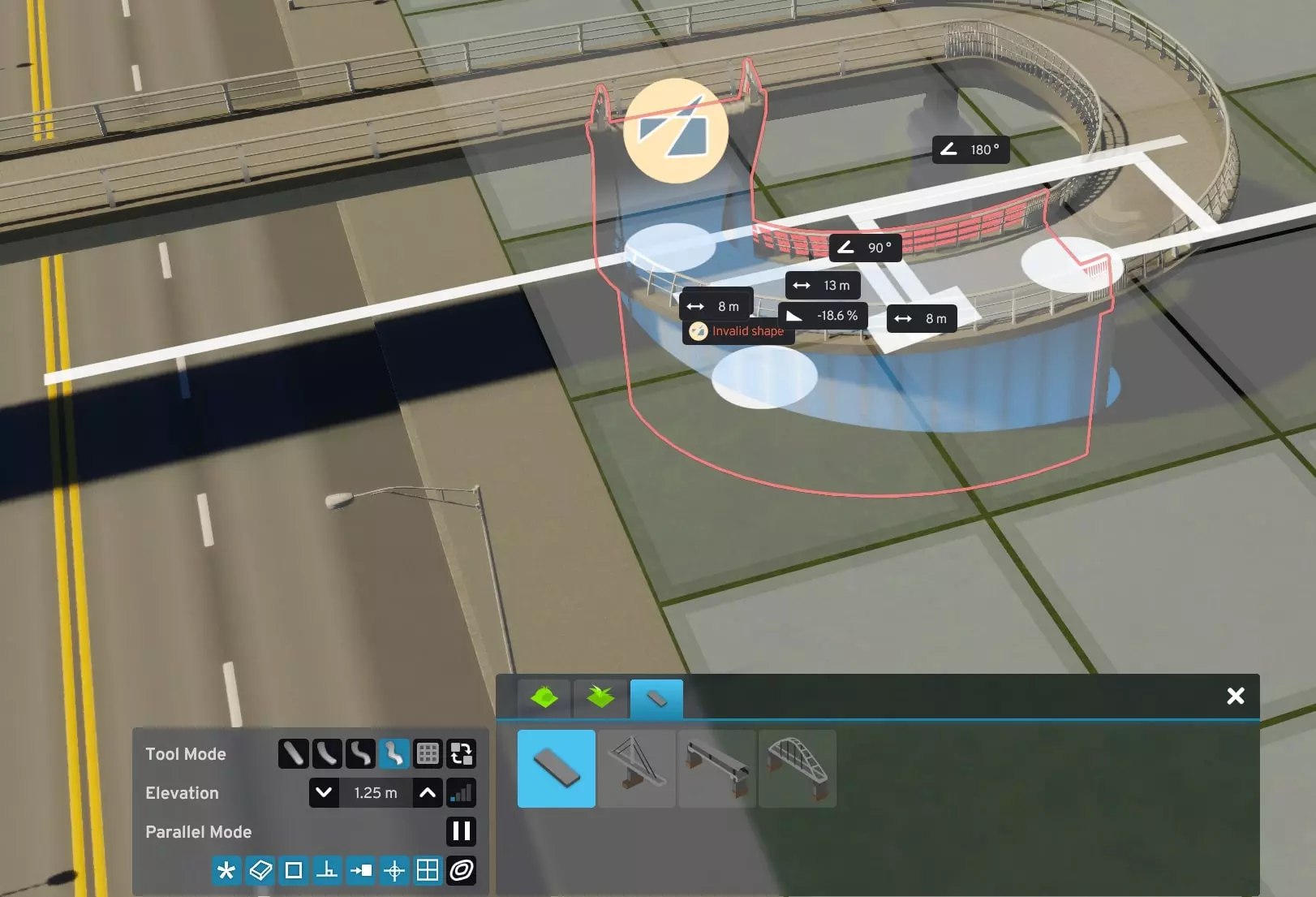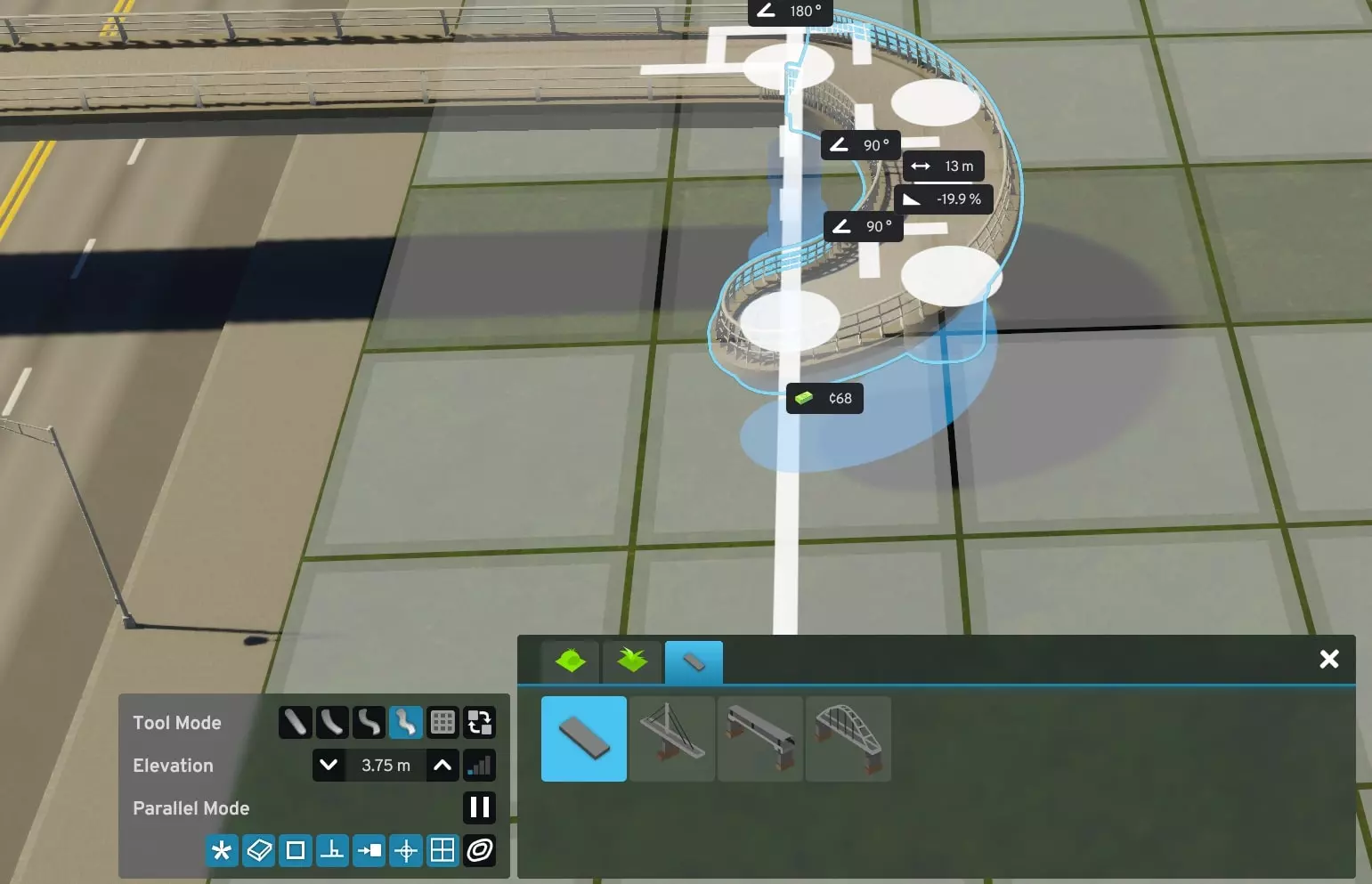 如果你遇到过这种情况,我或许有个解决办法。受Reddit用户LyrukoF发布的一个酷炫环形坡道帖子启发,我开始模仿他们的设计。在这个过程中,我还弄明白了如何让市民真正使用它。 建造桥梁 主要难点在于: 1. 确保它能实际建造出来 2. 附近有额外的交叉通行选项(这很糟糕) 3. 保持自己的理智 从你的主干道开始。我选择了一条简单的四车道主干道。