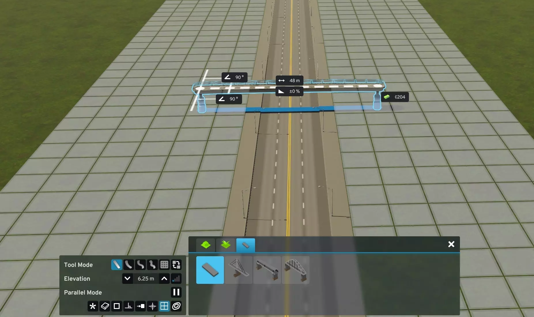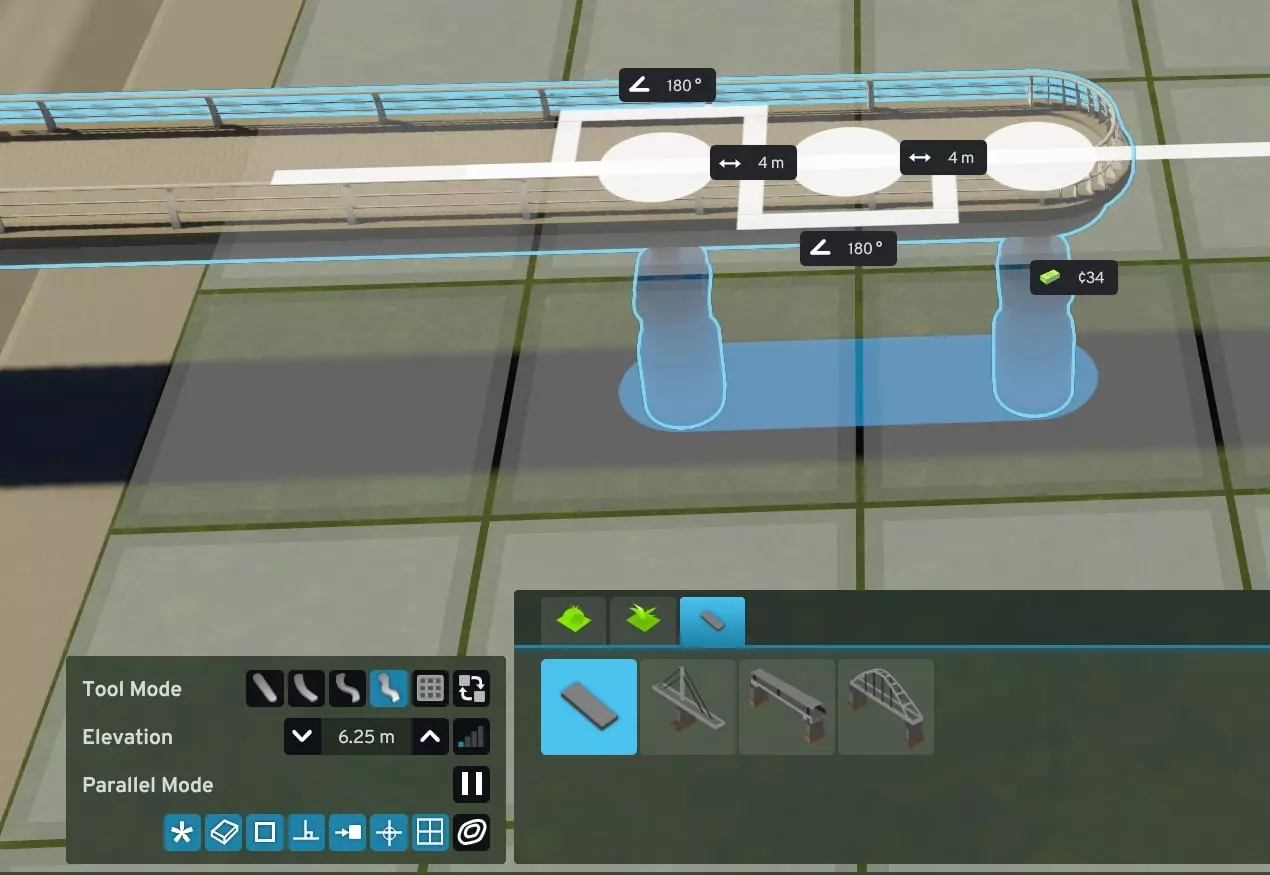 建造你的主跨。按照我想要的外观,我会将支柱延伸出一个分区方块。6.25米是桥梁能够跨越道路的最低高度。
