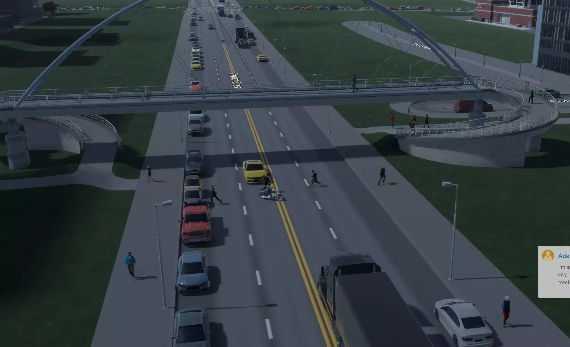 玩城市建造类游戏时,要是从根本上不喜欢以汽车为中心的城市设计,有时确实挺有挑战的。作为一名极度乐观的城市规划师,我希望市民们能步行出行。但有时为了让送货车和救护车通行,我不得不修建一条繁忙的道路。尽管我尽了最大努力,还是有数百人想要横穿这条路,这影响了交通流量。 既然混凝土很便宜,我就给他们建了一座漂亮又安全的人行天桥。 然后他们根本就不用。