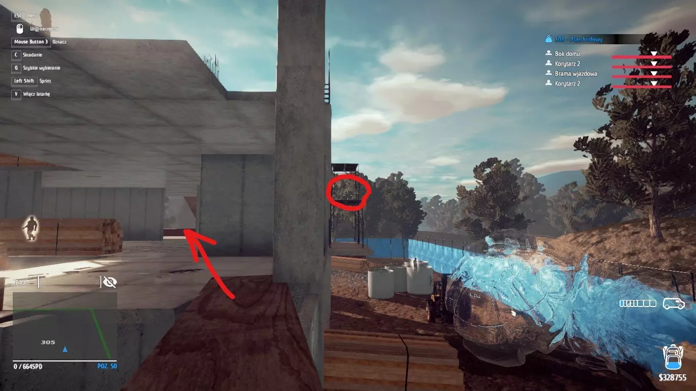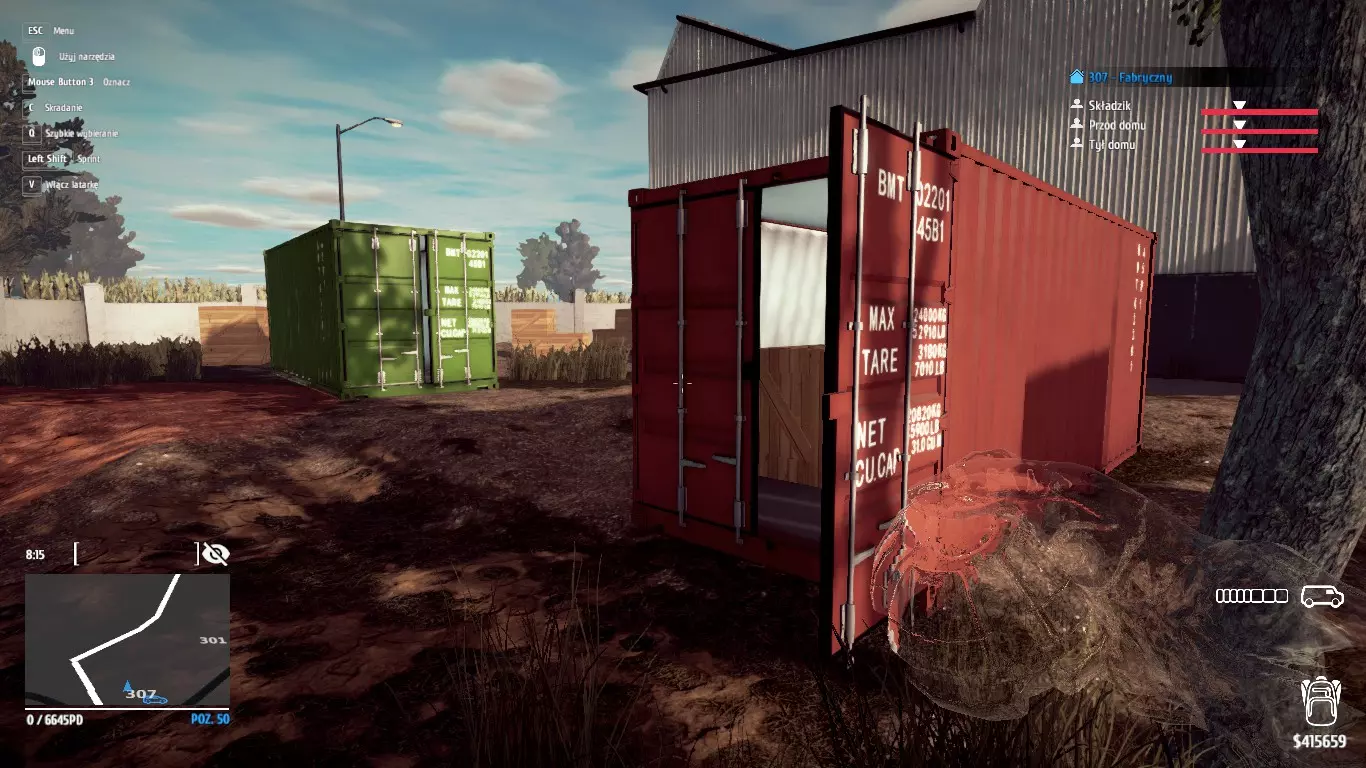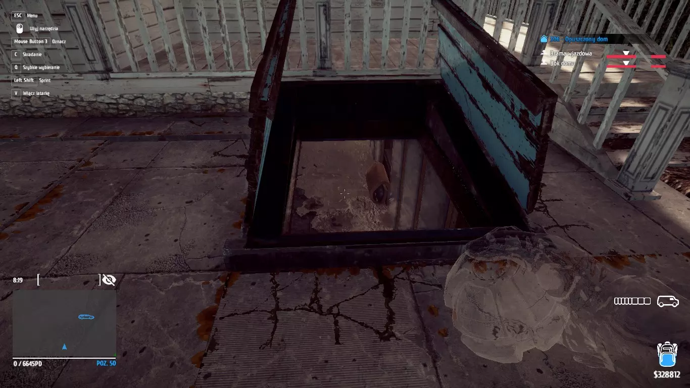 最麻烦的是标有圆圈的脚手架上的盒子。要到达上层,需要助跑并跳上红色集装箱,就像箭头指示的那样。这需要一些练习,但有了伪装装置,只是时间问题。上层有2个盒子;1个在横梁上,你肯定不会错过,另一个正如我所说在脚手架上,但需要跳到脚手架上才能收集包裹。 其余3个盒子散布在场景中,1个在大门旁的警卫小屋,1个在建筑的一层,1个在入口大门一侧的脚手架上。 -令人毛骨悚然。 偷走4个令人毛骨悚然的娃娃并在黑湾出售。三个万圣节成就中最简单的一个,因为所有东西都藏在一个地方——工业区的306号房子里。需要收集的第一个娃娃在二楼。下一个在一楼被“人体模型”挡住的房间里,我当时手电筒熄灭了,人体模型也消失了,所以我猜只要关掉手电筒就行。第三个在车库里,不知为什么我得在它周围绕了一会儿,但还是成功收集到了。最后一个在地下室,它有单独的外部入口,不需要做任何操作。下面是地下室入口的照片。