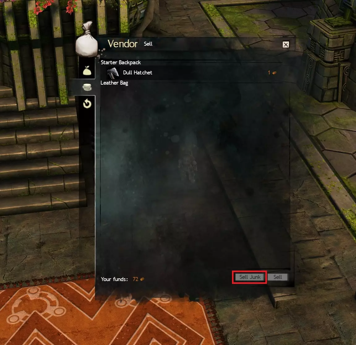 图示:闪亮红苹果(一种活动奖杯物品),以及活动NPC(农场帮手帕里斯)和橙色手形符号。声望心NPC可在他身后的背景中看到,其头顶有一个部分填充的爱心。 2.4 出售垃圾物品 要处理掉垃圾物品,请前往出售物品的商人处,例如标有一堆硬币图标的商人,然后点击“出售垃圾”按钮,如下所示。
