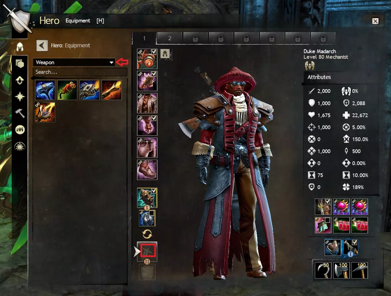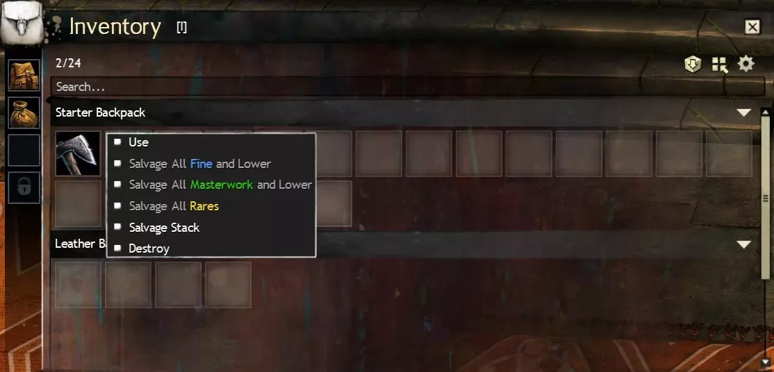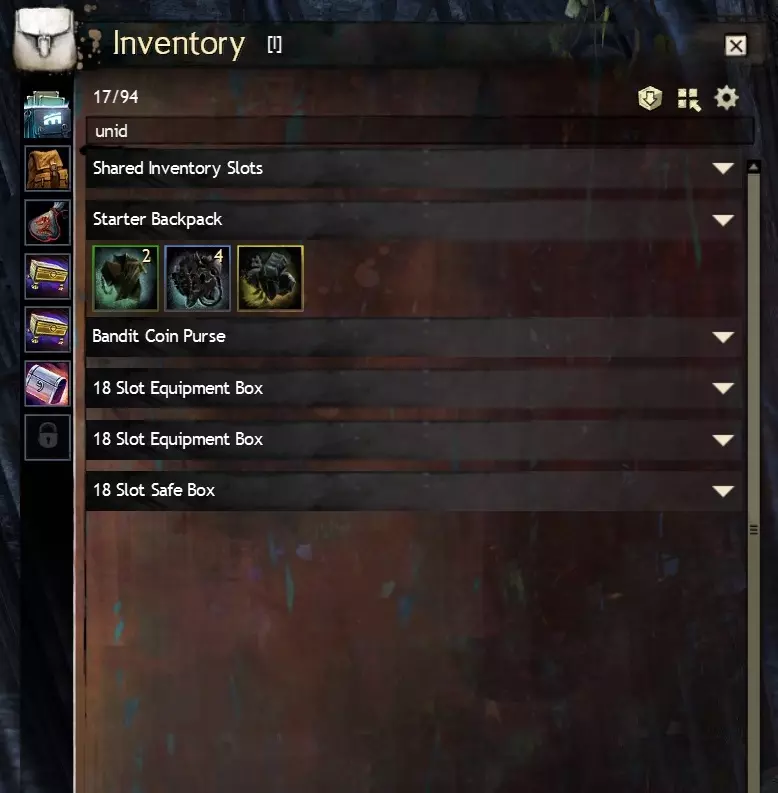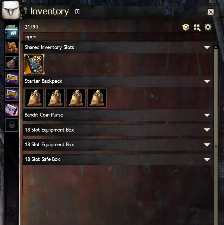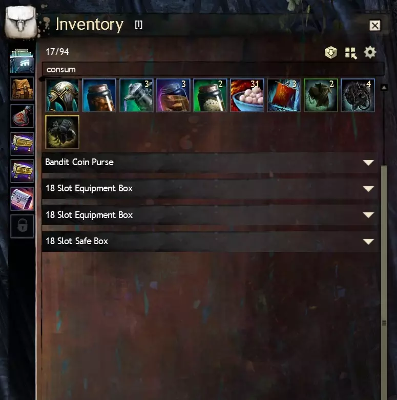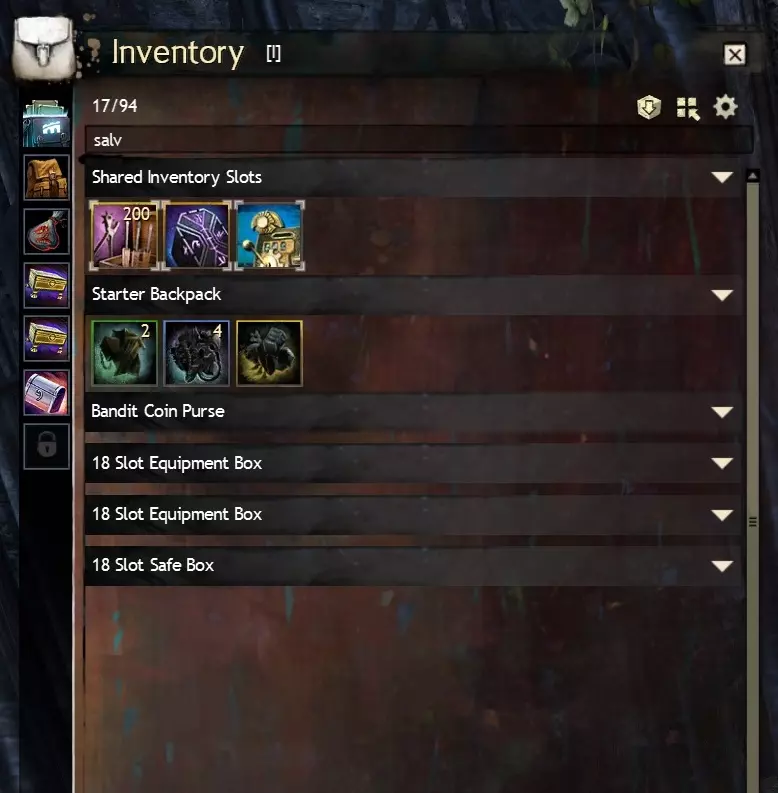 Craftsman's Bag: Crafting materials and upgrade components that drop will fill these bags first if slots are available. In my opinion these are the most useless variety of bag as crafting materials can always be deposited directly into your material storage using the Deposit All Materials button discussed in Salvaging and depositing materials (part two). The one big exception to this is if you want upgrade components such as sigils and runes you acquire to appear in one place, however they will be competing with crafting materials for these slots. Equipment Box: Weapons and armour that drop will fill these bags first if slots are available. I like these as an alternative to standard bags, especially if you have bag slots to spare, although the fact equipment boxes are not affected by the Compact button is a downside. Oiled Pack: Junk items will fill these bags first if slots are available. I find it handy to have one of these just to keep junk items separate from the rest of your drops, but these bags are entirely a matter of personal preference. Invisible Bag: (also: Invisible Pack & Safe Box): Items in these bags will not show up on sell to vendors lists, will not be salvaged when using salvage all options on a salvage kit and crafting items within these bags will not deposit when using 'deposit all' (you can still right-click crafting material stacks and order them to be deposited). These are incredibly useful and versatile bags for storing precious loot or spare equipment, I recommend equipping at least one of these bags. Note: when all other bags are full, loot and materials will start to fill this bag like it's a regular bag, so this may require a little extra micromanagement, but it's still practical to have one of these to make sure you don't accidentally sell or salvage items you want to keep. 10.3 Fractal Equipment BoxesFractal Equipment Boxes are 20 Slot Equipment Boxes that have the same rarity as the corresponding rarity they sort for: uncommon (green), rare (yellow) or exotic (orange). These bags are account bound and are generally purchased from the vendor BUY-4373[wiki.guildwars2.com] in the Fractals of the Mists (endgame PvE dungeons) for Fractal Relics (standard Fractal currency) + gold. Functionally, these are identical to an Equipment Box (ie you cannot Compact them) but with rarity sorting on top. This can be useful for separating out exotic weapons and armour you loot, I'd recommend getting one if any. 10.4 Equipment Pact Boxes and Marshal's Saddlebags:I'll be honest, I don't have any experience with the Equipment Pact Box. From what I understand they are rare bags that require armoursmithing, leatherworking or tailoring 400 and are 20 slots, but with the major caveat that they are soulbound, not account bound, meaning you cannot even transfer them between characters. Apparently they combine the functionality of equipment boxes and invisible bags, but as they are soulbound and you generally want to salvage or sell (TP) most weapons and armour you loot (not hide them in an invisible bag) I do not recommend these at all, ever. They also require a Superior Rune of Holding for 10g from a Master Craftsman. An Equipment Pact Box can be upgraded into a Marshal's Saddlebag. Marshal's Saddlebags are ascended bags that have the same functionality as Equipment Pact Boxes but have >20 slots and are account bound. Crafting them is very expensive (over 30g including the Pact Equipment Box needed in the recipe for 1x24 slots, over 80g for 1x28 and over 200g for 1x32). Marshal's bags are account bound, but as again, you generally want to salvage or sell most weapons and armour you loot, instead of them automatically landing in an invisible bag, I recommend Boreal bags as they are cheaper to make. 10.5 Pillager's Packs and Siegemaster's Satchels (WvW)Pillager's Packs and Siegemaster's Satchels are bags bought from a (WvW) Outfitter[wiki.guildwars2.com] and cost Badges of Honour (standard WvW currency) + gold. Pillager's Packs are functionally identical to standard bags, Siegemaster's Satchels are specialised bags that prioritise consumables such as food, utility consumables and siege blueprints. Both these bag types come in 18 slot rare or 20 slot exotic variants. Their gold cost is lower than that of equivalent 18 or 20 slot bags at 1.5 and 7g respectively. You will first need to unlock the Provisions Masters WvW ability in the last tab of the WvW interface (default hotkey B) in order to buy these from an Outfitter in WvW. Note: F2P players must reach level 60 on any character in order to access WvW. 10.6 Ascended Bags (advanced, >20 slots)Bags with >20 slots are of the pink (ascended) rarity and are account bound, meaning you can move them between alts using your bank. Apart from two that are available from achievements and briefly mentioned in the Cheap 20 Slot Bags section, these are obtained via crafting and are very expensive at over 30g each for 24 slots, over 80g for 28 and over 200g for 32. Boreal bags (from LWS5: The Icebrood Saga) work out slightly cheaper at over 30g for 24 slots, over 60g for 28 and over 140g for 32). Ascended Bags come in standard and specialised varieties too, corresponding to their non-ascended equivalents. Standard ascended bags: 24, 28 and 32 Slot Gossamer Saddlebag 24, 28 and 32 Slot Hardened Leather Pannier 24, 28 and 32 Slot Orichalcum Locker 24 Slot Simple Boreal Canteen, 28 Slot Sturdy Boreal Duffel, 32 Slot Reinforced Boreal TrunkSpecialised ascended bags: Craftsman's: Cowrie League SaddlebagEquipment: Nomad's LockerOiled: Hamaseen PannierInvisible: Courier's Locker Courier's Pannier Courier's Saddlebag 11.0 Bonus: Suggested bag composition F2P: Starter backpack 18 slot bag 18 slot bag B2P: Starter backpack 18 slot bag 18 slot bag 18 slot oiled bag 18 slot invisible bag B2P: Starter backpack 18 slot equipment box 18 slot equipment box 18 slot oiled bag 18 slot invisible bag 12.0 Bonus: Equipment templates (loadouts) >12.1 Your second loadout 