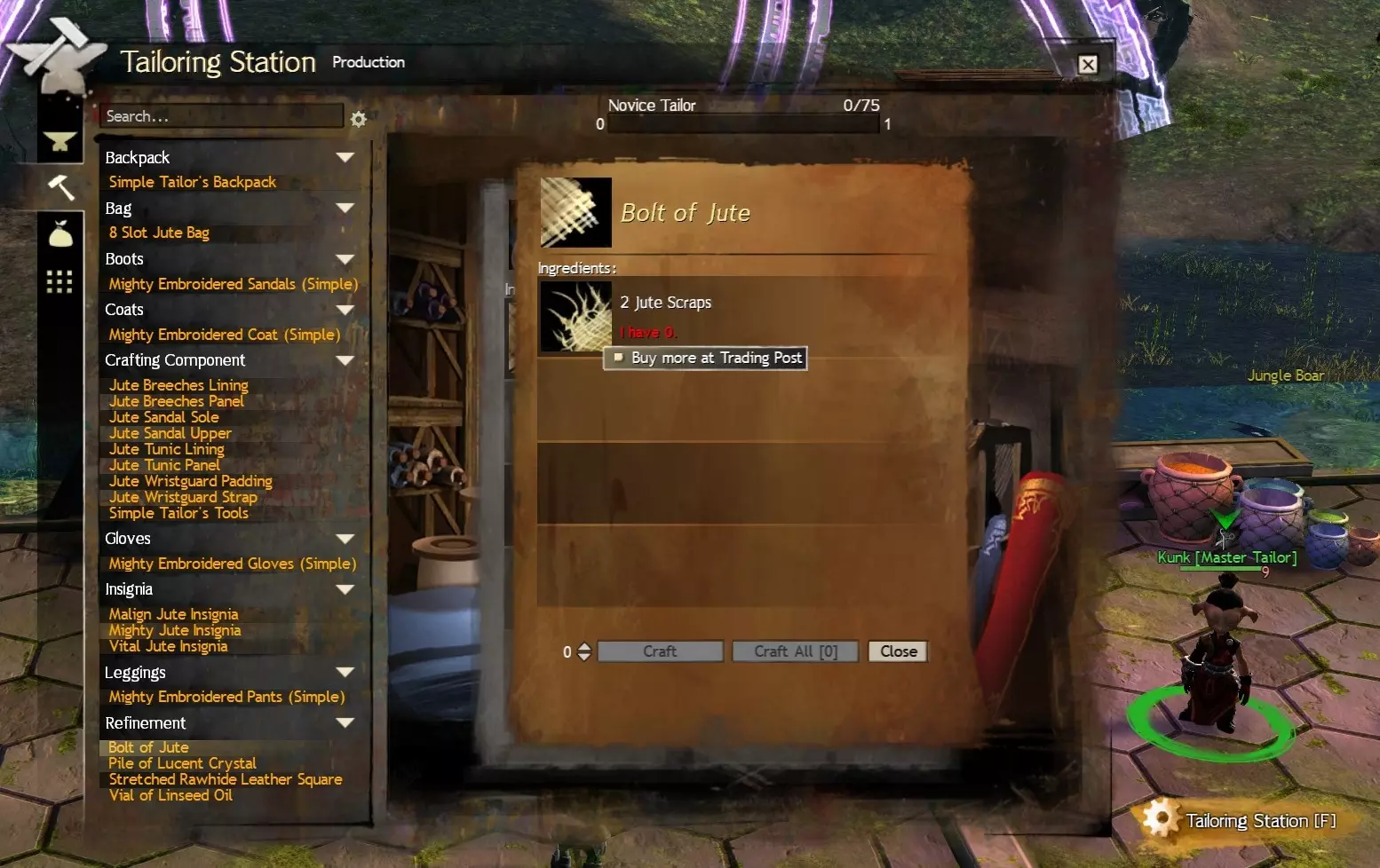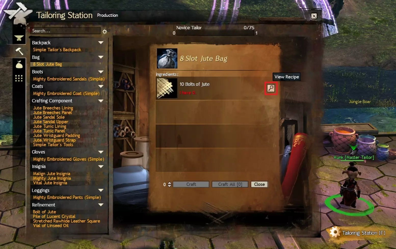 目前(2022年9月),制皮专业制作的8格生皮皮革包是成本最低的选择,需要10个拉伸生皮皮革片(可从交易行购买或由20个生皮皮革块制作而成),通过交易行购买材料制作每个包的总成本约为5银。 锻造专业制作的8格强化青铜盒需要10个青铜锭(可从交易行购买,或由20个铜矿石和2个锡块制作;锡块可从锻造大师NPC处以80铜购买10个,也可从交易行购买),总成本约为11银。 裁缝专业制作的8格黄麻包需要10个黄麻卷(可从交易行购买或由20个黄麻碎片制作而成),总成本约为13银。考虑到制作这些袋子所需的材料成本,出售它们并不盈利,因此我不推荐这种方法。不过,如果你需要自己 farming【刷】材料,锻造【armoursmithing】可能是最简单的选择,因为你可以从商人处购买一把铜镐(或通过升级奖励获得),然后开采铜矿节点,同时从锻造大师 NPC 处花费 80 铜币购买一批锡。而裁缝和制皮则需要你分解【salvage】 loot【拾取到的】装备来获取必要的材料。### 分步指南 本部分以裁缝专业为例,介绍如何制作这些背包。不过,建议你在开始前再次查看材料价格,或者考虑如上文所述哪种材料最容易收集。如概述中提到的,不同专业之间的主要区别在于背包的名称以及所使用的材料。 首先,通过地图(默认按键M)或小地图找到大师级工匠NPC。在新手区域,这些NPC通常位于每个区域的银行枢纽附近(这部分内容在我的指南中“访问银行和交易站”章节有介绍)。另外,你也可以进入种族首都城市寻找他们,买断制玩家可直接进入,免费玩家则需达到10级。