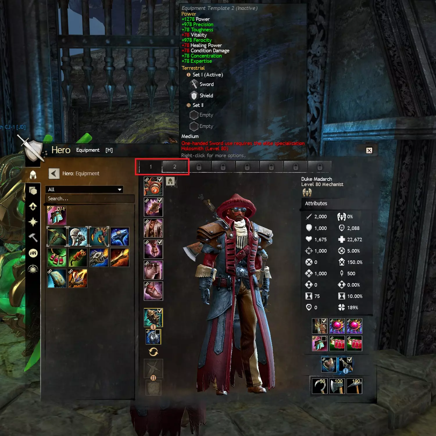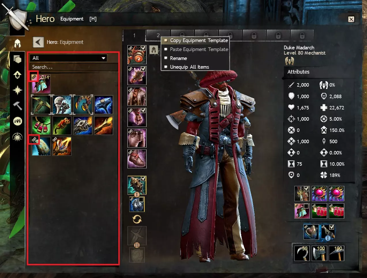 左键点击这些数字将调出并激活其中存储的装备套装;右键点击这些数字可以重命名装备套装,或将一个装备套装复制粘贴到另一个模板上(执行此操作时,未被其他套装使用的被覆盖装备会自动移至你的背包)。 你可以从背包中为配装方案装备物品,或使用英雄面板左侧的网格显示来操作。点击特定装备栏位(头部、肩部、主手、副手、项链、戒指等)可以筛选显示对应栏位的装备。如图所示,我们已选中角色副武器的主手栏位,因此游戏会显示我们可用的主手武器和双手武器。按槽位类型筛选具有额外用途,即仅显示与该槽位相关的升级组件,例如武器的【符印】和护甲的【符文】。 【链条图标】: 带有链条图标的物品当前正在其他装备模板中使用。将其装备到当前激活的模板不会使其从其他模板中卸下,但你可以右键点击装备,选择从所有模板中卸下该装备(如果你需要的话)。 【金色链条图标】: 带有金色链条图标的物品是【传奇物品】,可以自由装备到任何能够穿戴或使用该类型物品的角色的装备模板上。购买后即玩(B2P)玩家使用80级直升角色的注意事项:对于已将某个专业升至80级的购买后即玩玩家,你可以放心地将直升获得的护甲套装存入一个配置方案,因为全属性的天体护甲套作为备用装备非常有价值,同时可以在另一个配置方案中尝试不同属性的其他护甲套装。 12.3 装备和build模板的按键绑定 非常实用的技巧:你可以为各个build和装备标签页分配按键绑定,以便快速切换,就像为各个坐骑和专精技能(钓鱼、小艇)设置按键绑定一样。我个人将build和装备标签页绑定在小键盘上相邻的按键,以便极其轻松地切换角色定位。