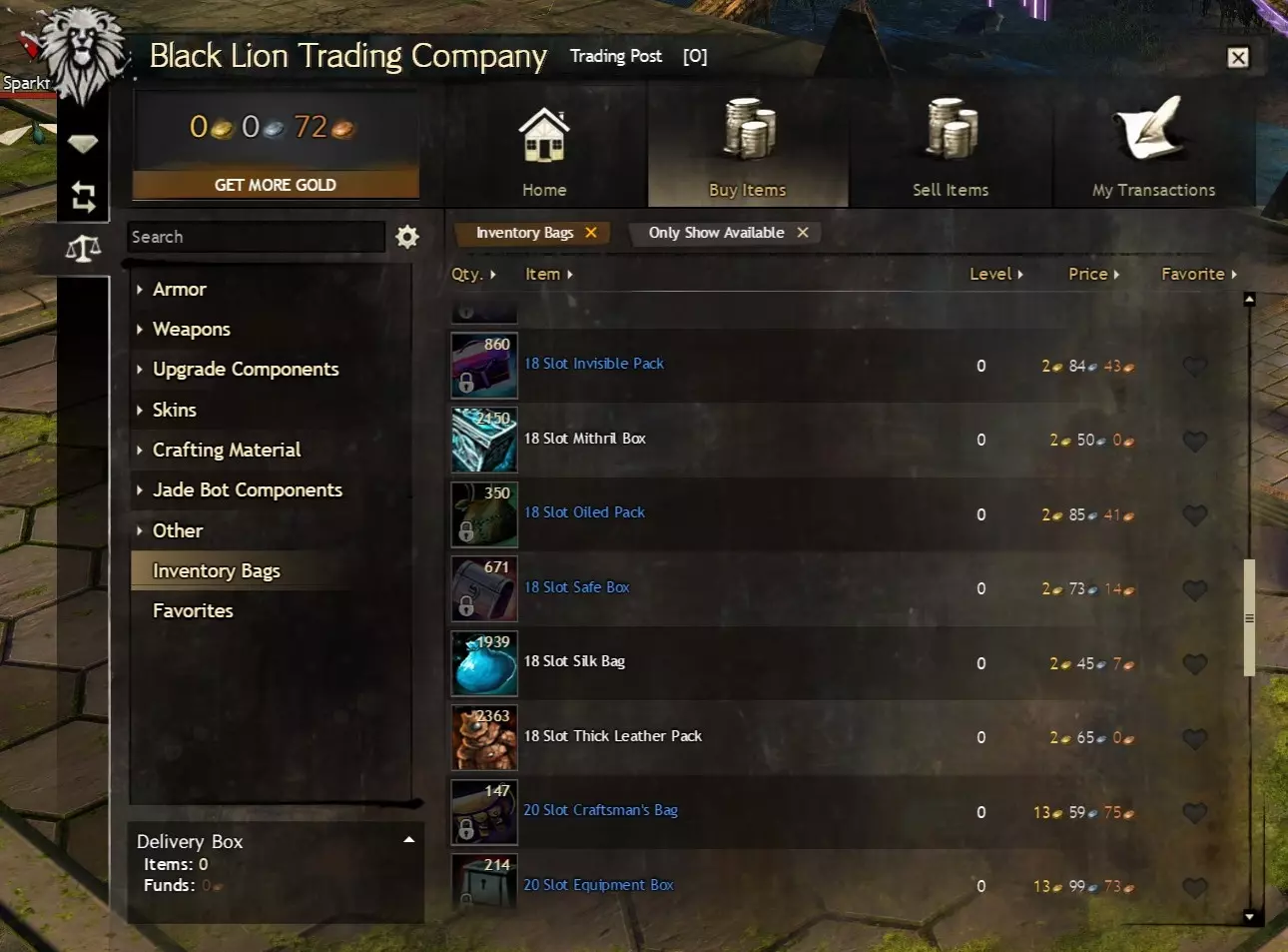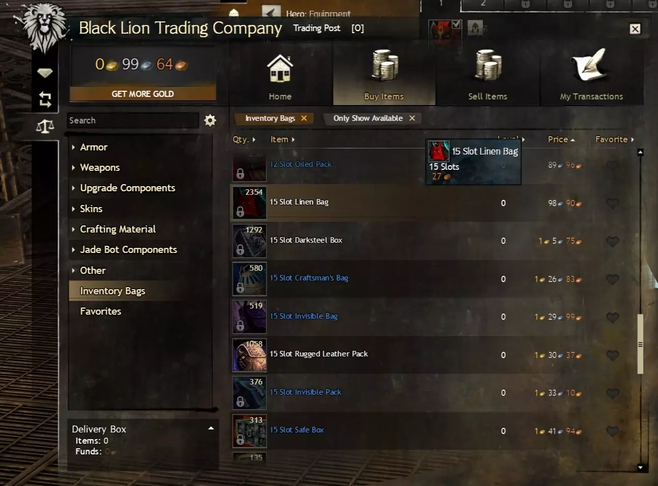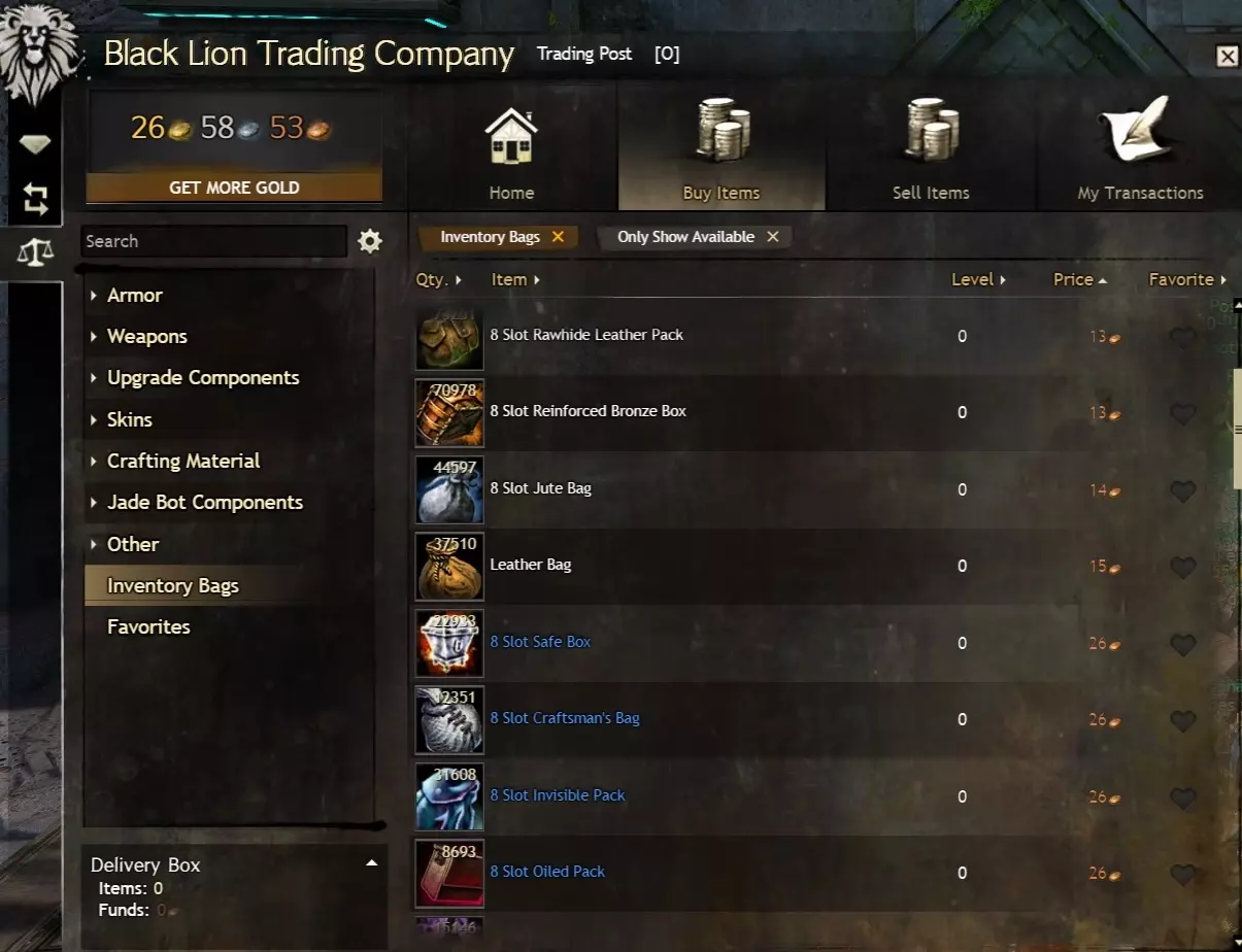 进入世界之战也是可行的,但作为免费玩家,你需要达到60级才能解锁该模式。而且无论你是买断制玩家还是免费玩家,当你在世界之战中处于闲置状态时,当前的世界之战参与度等级都会衰减。要打开世界之战面板,请点击屏幕左上角的城堡塔楼图标(默认快捷键B)。世界之战中有许多有用的商人,其中一些商人的金币价格甚至有折扣,但需要荣誉徽章来支付(荣誉徽章是世界之战的标准货币,获取难度较低)。 5.4 材料仓库的金币价值 我认为值得在此提及的是,你的材料仓库可能是一个重要的金币来源。在《激战2》中游玩几个月后,你通过采集获得的材料存放在仓库里,其价值很容易达到数百金币,这些材料可以卖给交易行,或者攒起来用于制作终局装备。我强烈推荐使用相关工具来实现这一目的,该工具非常适合查看你的材料存储价值(总计以及按类别和单个材料堆叠细分),还能查看你拥有的材料与制作特定升华或传奇装备所需材料之间的差异。 6.0 你的第二个背包(10格) 可选:如果你已攒够金币(例如通过完成日常任务或地下城获得),或者觉得暂时不需要额外的格子,可以直接跳至本指南的15格和/或18格部分。 有关从交易平台购买的详细说明,请阅读我指南中的【初始背包(买断制)】部分。这一点也适用于免费玩家,但10级前的免费玩家需要前往女王谷盗墓者高地附近的交易行配送员处(本指南的【访问银行和交易行】部分已讨论)。10级后,免费玩家可以像买断制玩家一样访问各首都城市的交易行配送员。 买断制玩家:4个10格背包的买入订单价格约为60银,即时购买则需1.2金。 免费玩家:2个10格背包的买入订单价格约为30银,即时购买则需0.6金。 开始操作时,请打开屏幕左上角狮子头图标所示的黑狮交易公司菜单(默认快捷键O),然后向下导航至交易行。