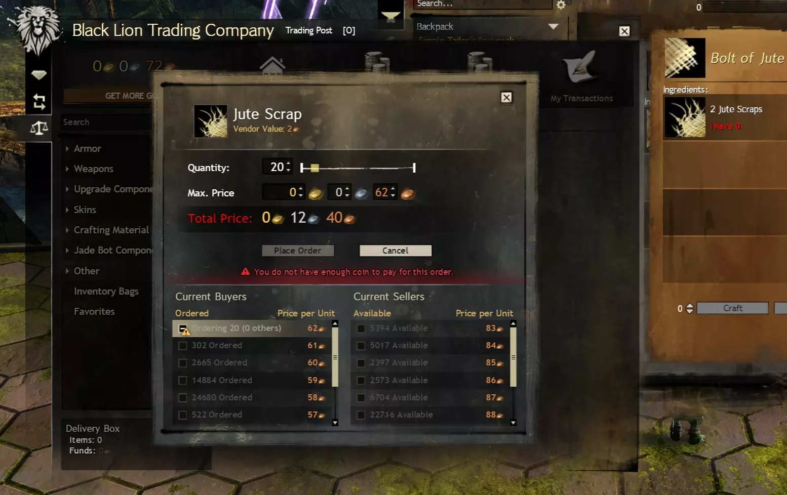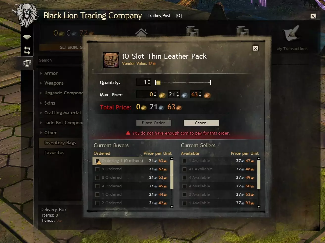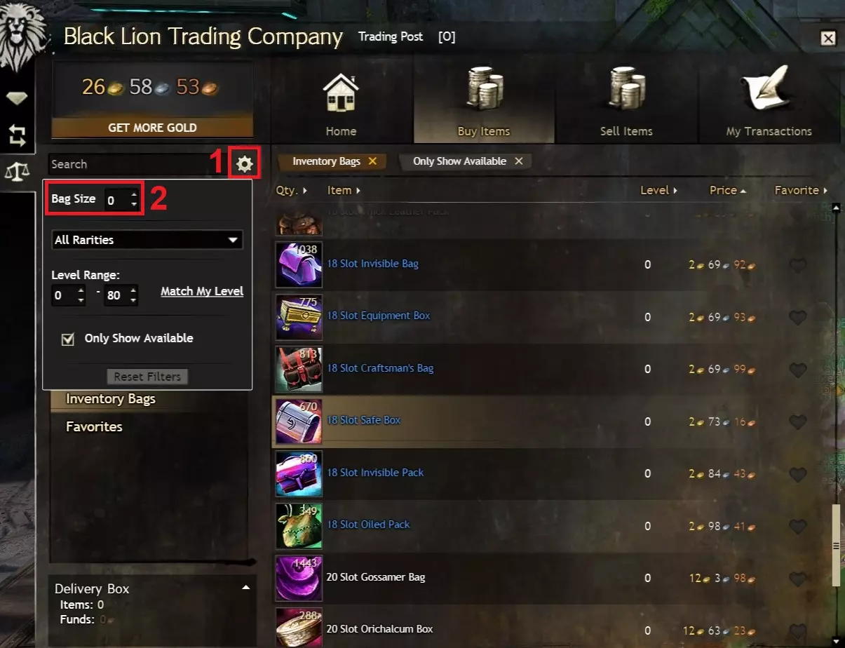 进入世界之战也是可行的,但作为免费玩家,你需要达到60级才能解锁该模式。而且无论你是买断制玩家还是免费玩家,当你在世界之战中处于闲置状态时,当前的世界之战参与度等级都会衰减。要打开世界之战面板,请点击屏幕左上角的城堡塔楼图标(默认快捷键B)。世界之战中有许多有用的商人,其中一些商人的金币价格甚至有折扣,但需要荣誉徽章来支付(荣誉徽章是世界之战的标准货币,获取难度较低)。 5.4 材料仓库的金币价值 我认为值得在此提及的是,你的材料仓库可能是一个重要的金币来源。在《激战2》中游玩几个月后,你通过采集获得的材料存放在仓库里,其价值很容易达到数百金币,这些材料可以卖给交易行,或者攒起来用于制作终局装备。我强烈推荐使用相关工具来实现这一目的,该工具非常适合查看你的材料存储价值(总计以及按类别和单个材料堆叠细分),还能查看你拥有的材料与制作特定升华或传奇装备所需材料之间的差异。 6.0 你的第二个背包(10格) 可选:如果你已攒够金币(例如通过完成日常任务或地下城获得),或者觉得暂时不需要额外的格子,可以直接跳至本指南的15格和/或18格部分。 有关从交易平台购买的详细说明,请阅读我指南中的【初始背包(买断制)】部分。这一点也适用于免费玩家,但10级前的免费玩家需要前往女王谷盗墓者高地附近的交易行配送员处(本指南的【访问银行和交易行】部分已讨论)。10级后,免费玩家可以像买断制玩家一样访问各首都城市的交易行配送员。 买断制玩家:4个10格背包的买入订单价格约为60银,即时购买则需1.2金。 免费玩家:2个10格背包的买入订单价格约为30银,即时购买则需0.6金。 开始操作时,请打开屏幕左上角狮子头图标所示的黑狮交易公司菜单(默认快捷键O),然后向下导航至交易行。