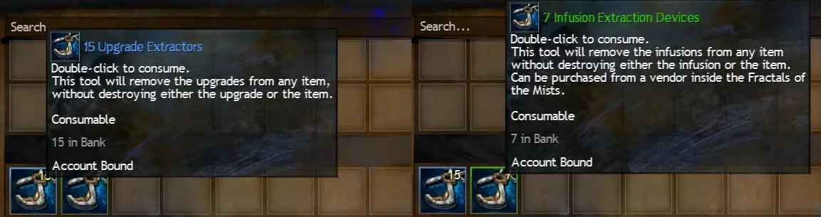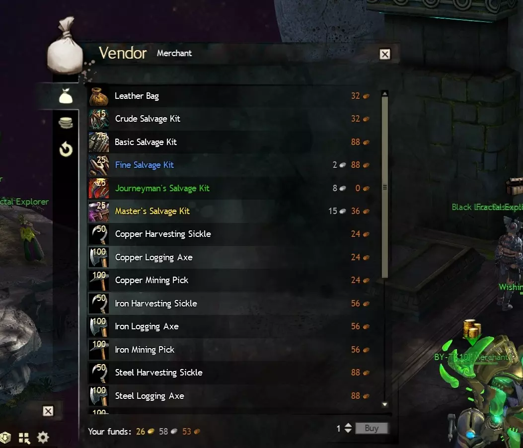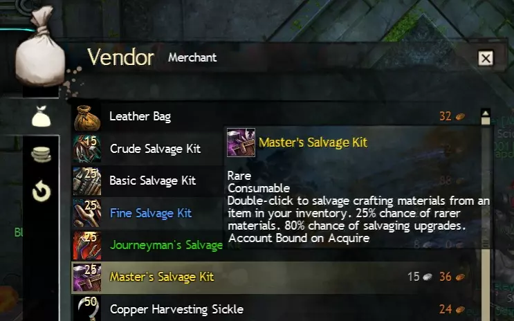 在聊天框输入“consumable”将显示你背包中的所有消耗品,包括食物、实用消耗品、容器(包括战利品袋和未鉴定物品)、经验消耗品、拆解工具等。输入“open”将显示战利品袋等可打开的物品。 2.6 使用/wiki命令 如果你对游戏中的某些内容不了解,可以在聊天窗口输入“/wiki <查询内容>”并按回车键,即可在浏览器中打开《激战2》维基百科的相应页面。你可以手动输入查询内容,也可以按住Shift键点击物品来输入其代码直接查询。这是查看你背包中的物品在未来是否有用的好方法。 3.0 拆解与材料存放(第一部分) 3.1 拆解工具的类型和用途 3.2 拆解选项3 - 从背包中存放材料 >3.4 - 运气 >3.5 - 未鉴定装备 3.1 - 拆解工具的类型和用途 在《激战2》中,拆解是避免背包塞满的最关键方法。普通商人会根据自身等级提供不同等级的物品,其中包括拆解工具。左侧窗口显示的是新手区域普通商人提供的物品,右侧窗口则显示在首都城市或枢纽区域可找到的高等级商人所提供的物品。