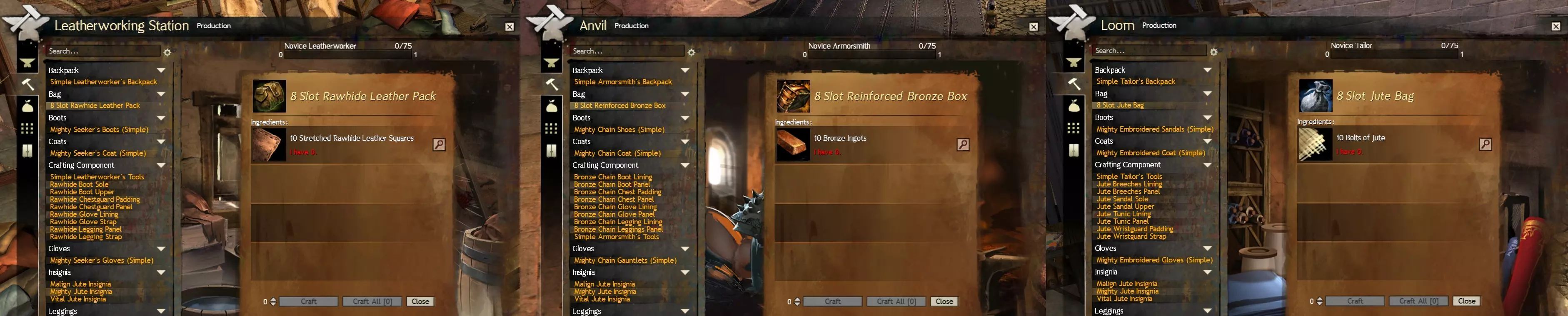 4.0c 制作背包(免费玩家) >4.1 概述与制作专精选择 >4.2 分步指南 4.1 概述与制作专精选择 虽然我不建议用这种方式代替从交易行购买背包(后者要便宜得多),但如果你是免费玩家,且确实想要8格背包而非4-5格背包,那么你可以通过制作来获取背包。为此,你有三种制作专精可选:盔甲锻造(重甲)、皮革制作(中甲)和裁缝(轻甲)。 注意:你可以在不同制作专精间切换,且不会丢失进度,但切换费用取决于你要切换到的专精等级。因此,你可能会想要选择制作背包成本最低的专精(或者你已经拥有其材料的专精)。