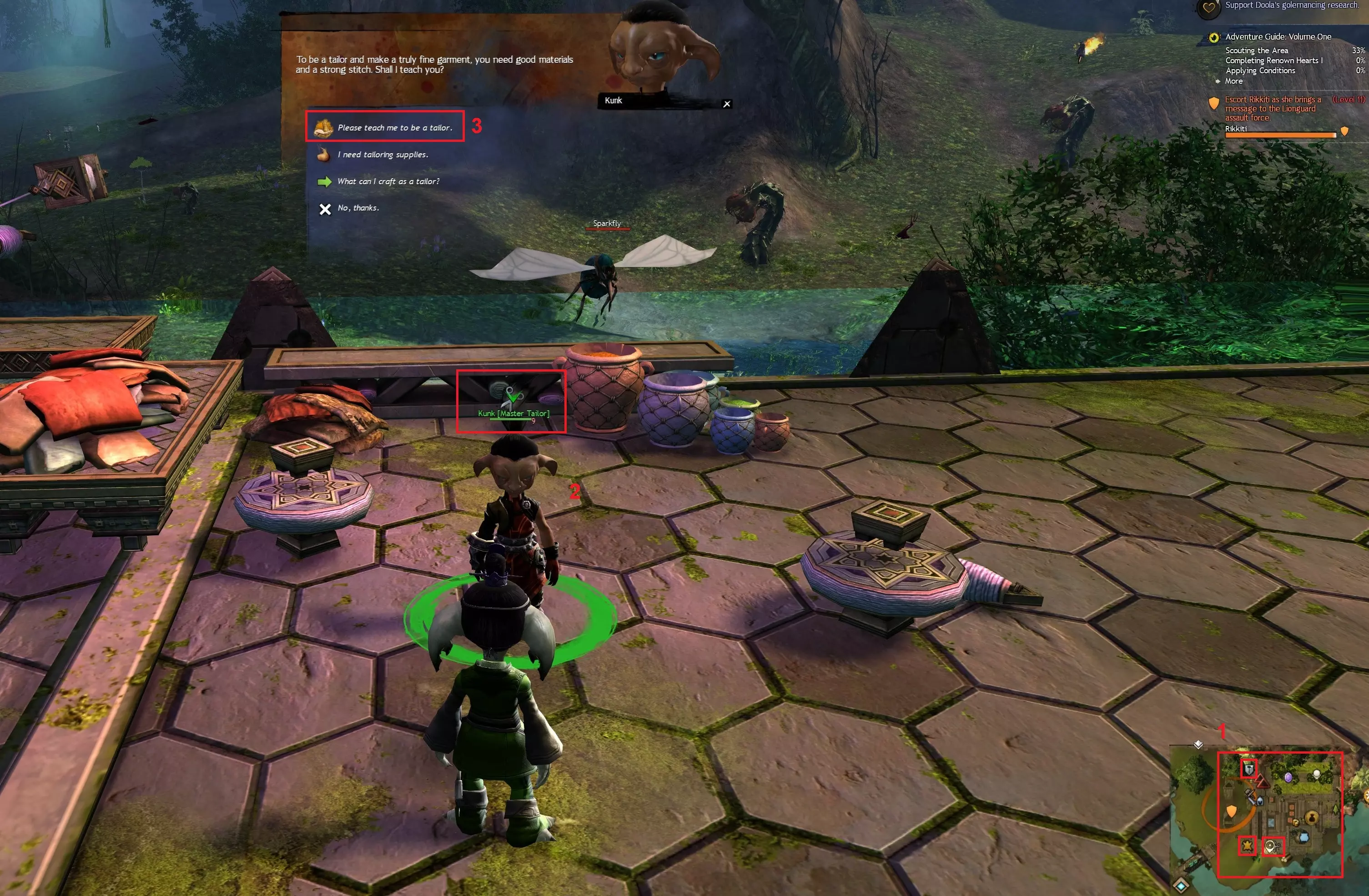 制作类NPC通常集中在一起,可通过他们的头衔(制皮大师、锻造大师或裁缝大师)以及小地图和头顶上的图标来识别。制皮大师以兽皮为标识,锻造大师以带有浮雕锤子的盾牌为标识,裁缝大师则以一把剪刀为标识。要学习他们的专业,只需与他们互动并选择“请教我成为一名【专业名称】”。