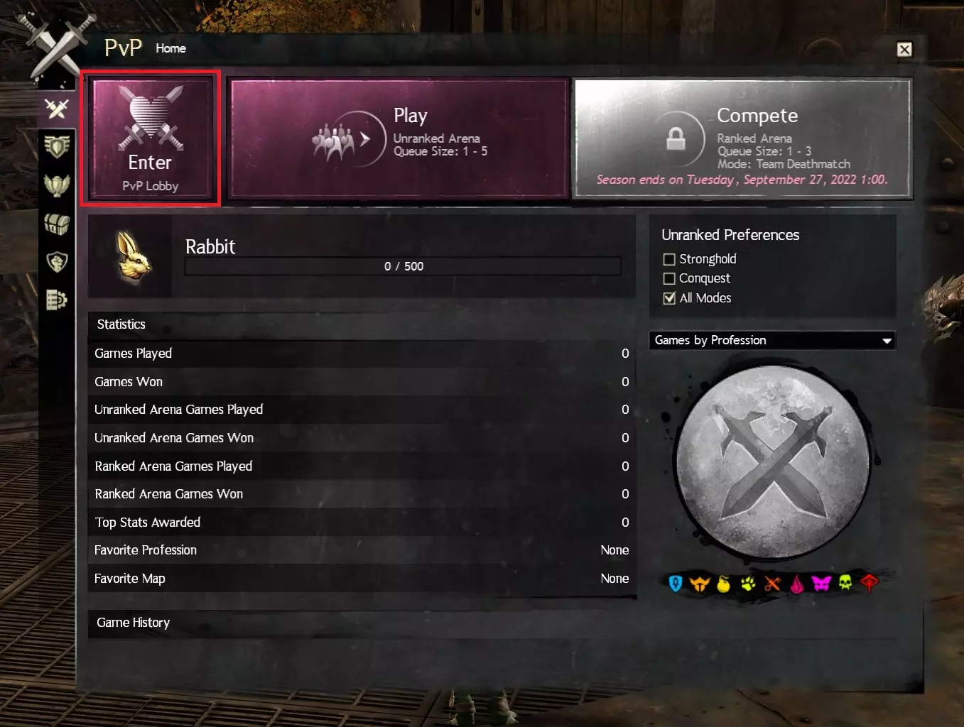 这将打开下方所示的PvP界面,你可以点击【进入PvP大厅】,这会将你传送至所示的PvP大厅。在小地图上,入口附近可以找到银行NPC和黑狮快递员。