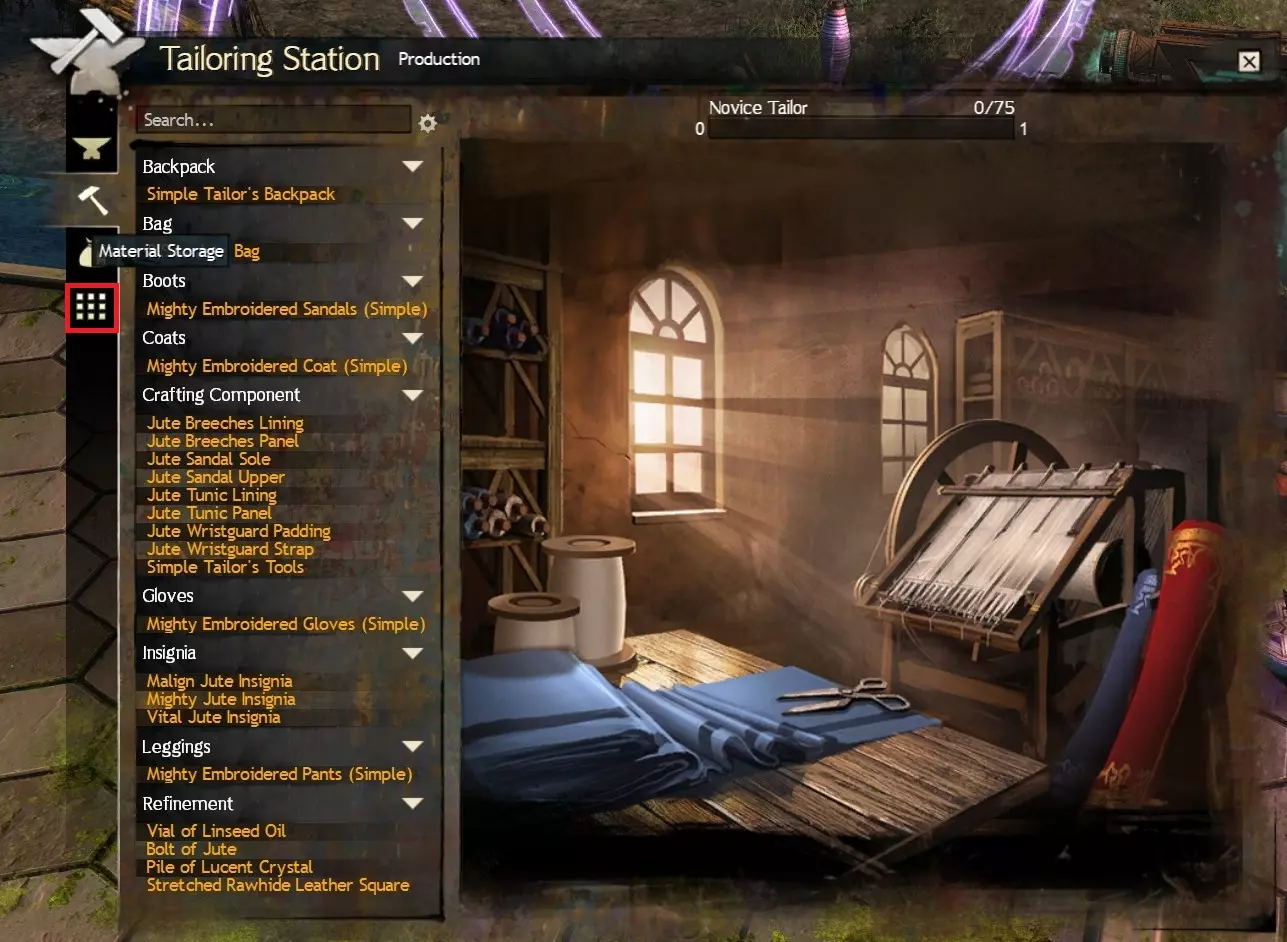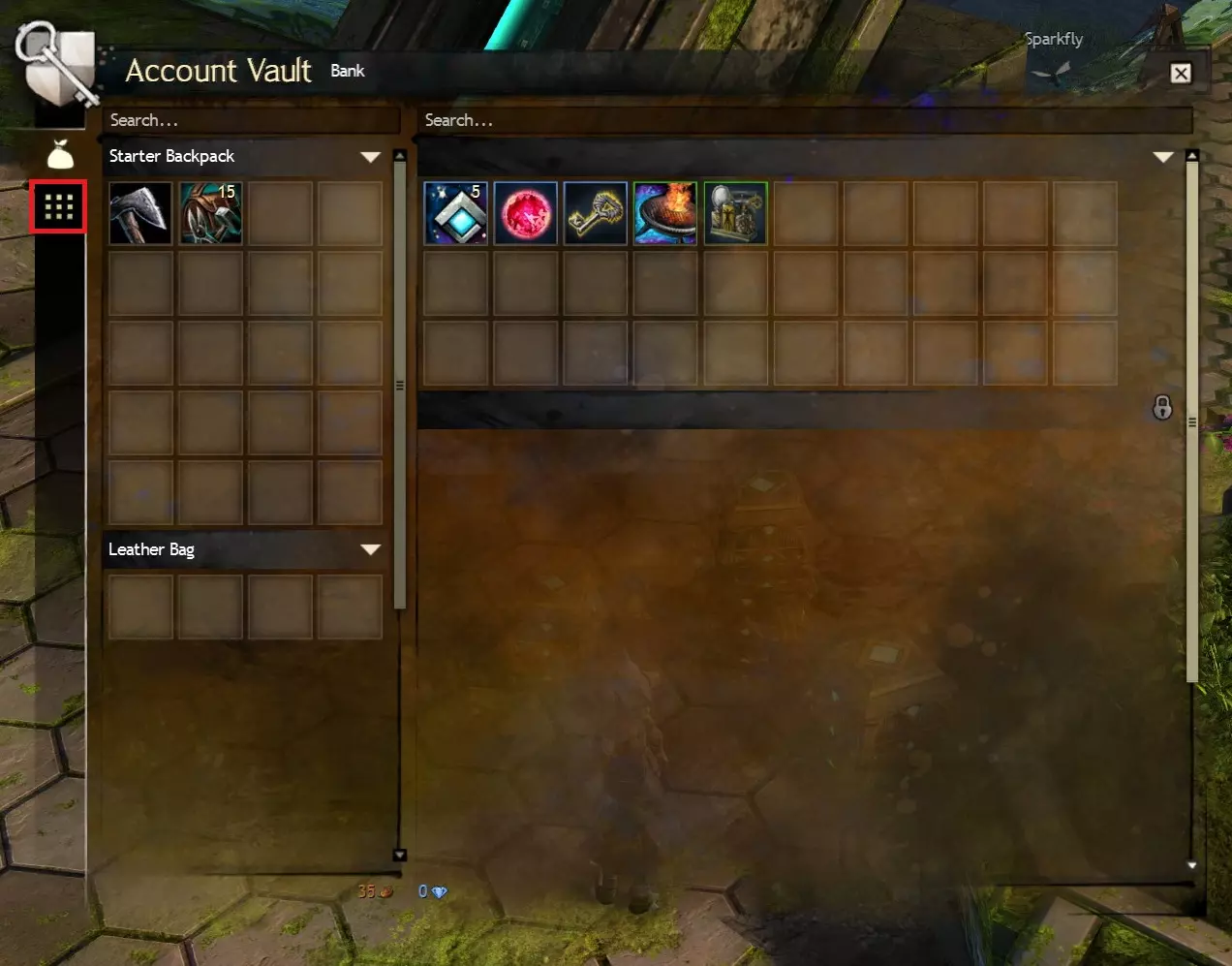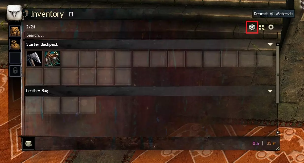 只需按下一个简单的按钮,你就能将背包中所有制作材料存入材料仓库,无论你在泰瑞亚的任何地方。这在采集资源节点或拆解物品后尤其有用,因为通过这些方式获得的绝大多数材料将不再占用你的背包空间,而是整齐地存放在仓库中。 之后,你可以通过银行(左侧)或制作 stations(右侧)点击网格图标来访问材料仓库,如下所示。本指南的【访问银行】部分将更详细地介绍这一点。