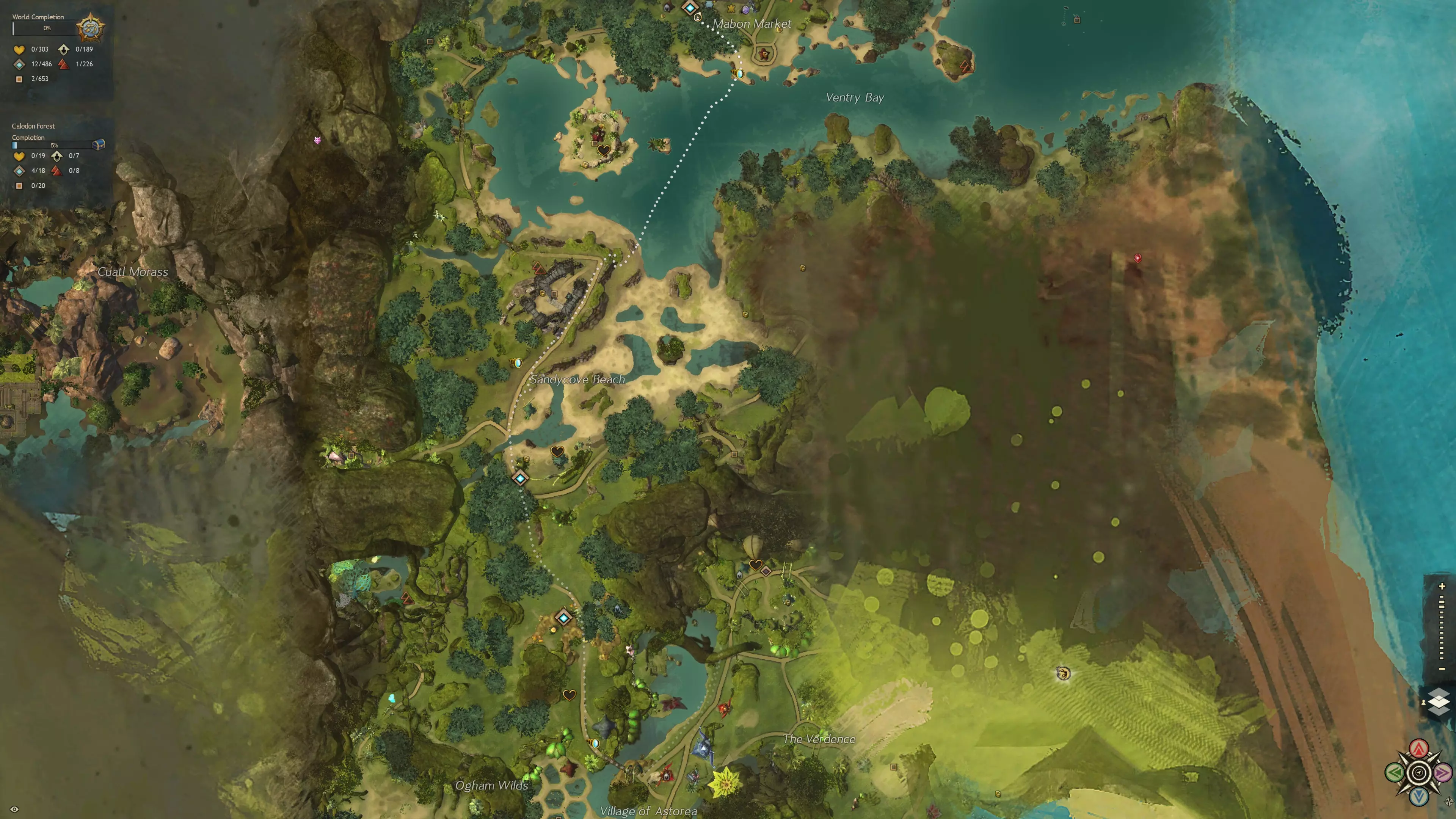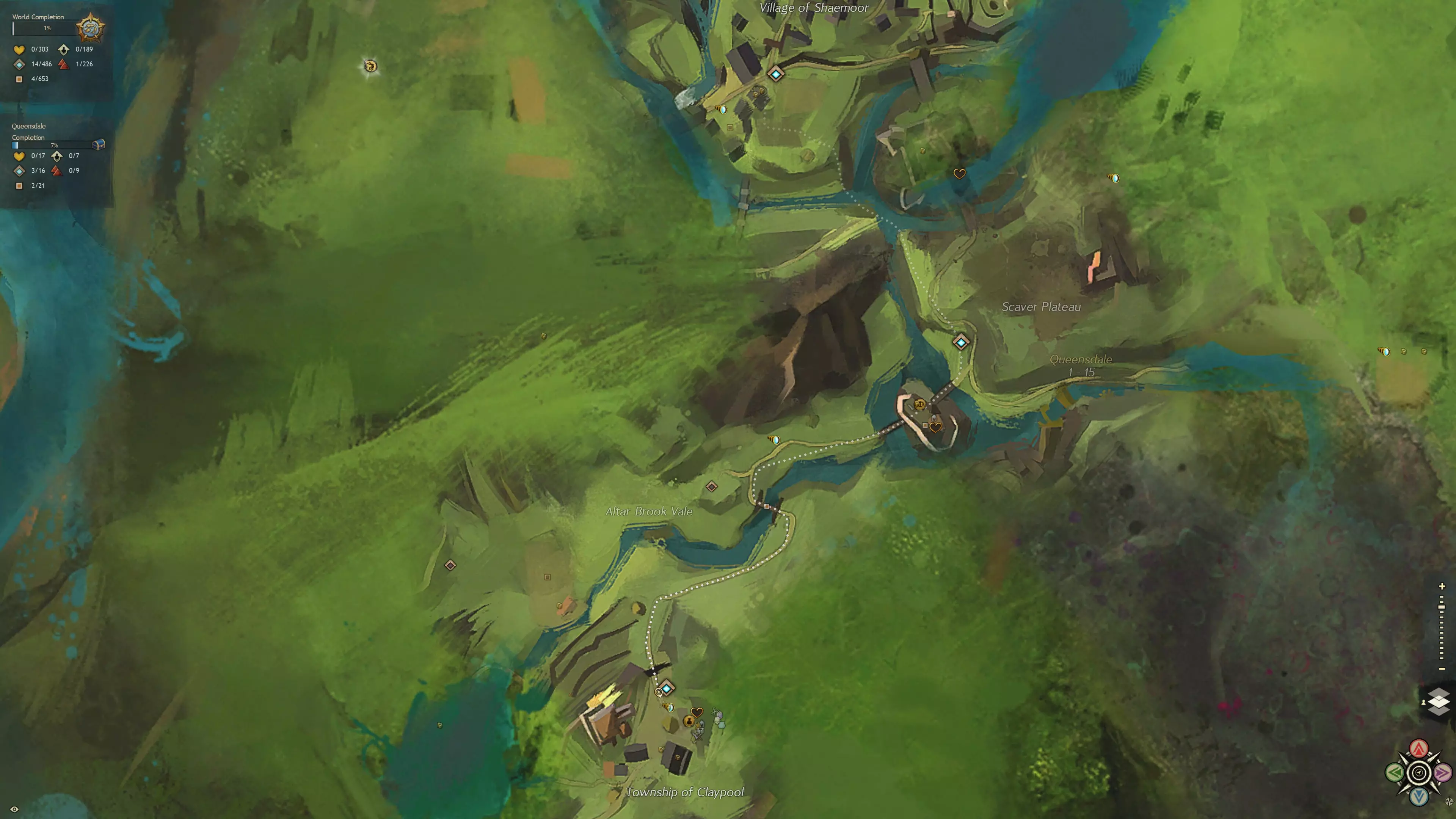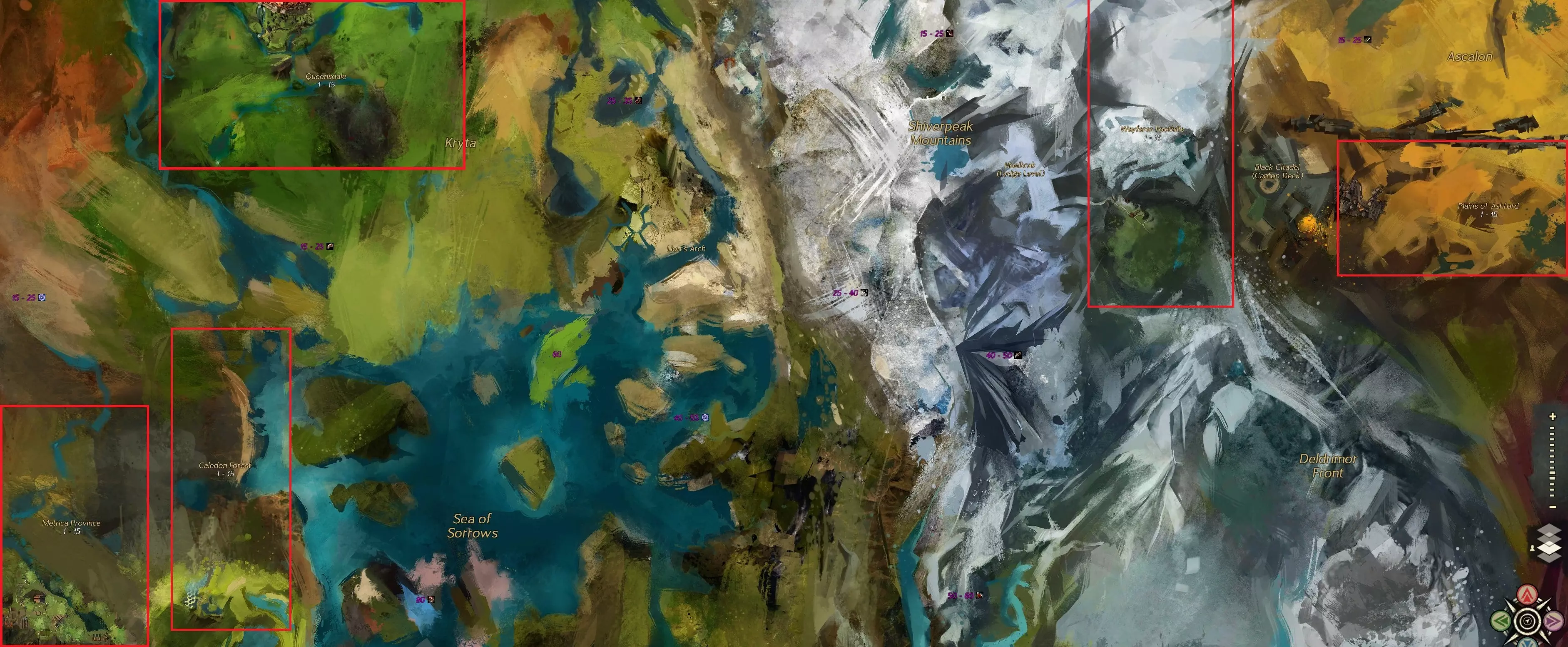 从左下角到右上角,起始区域分别为:梅特里卡省(阿苏拉)、卡勒顿森林(希尔瓦里)、女王谷(人类)、旅者丘陵(诺恩)以及阿什福德平原(夏尔)。