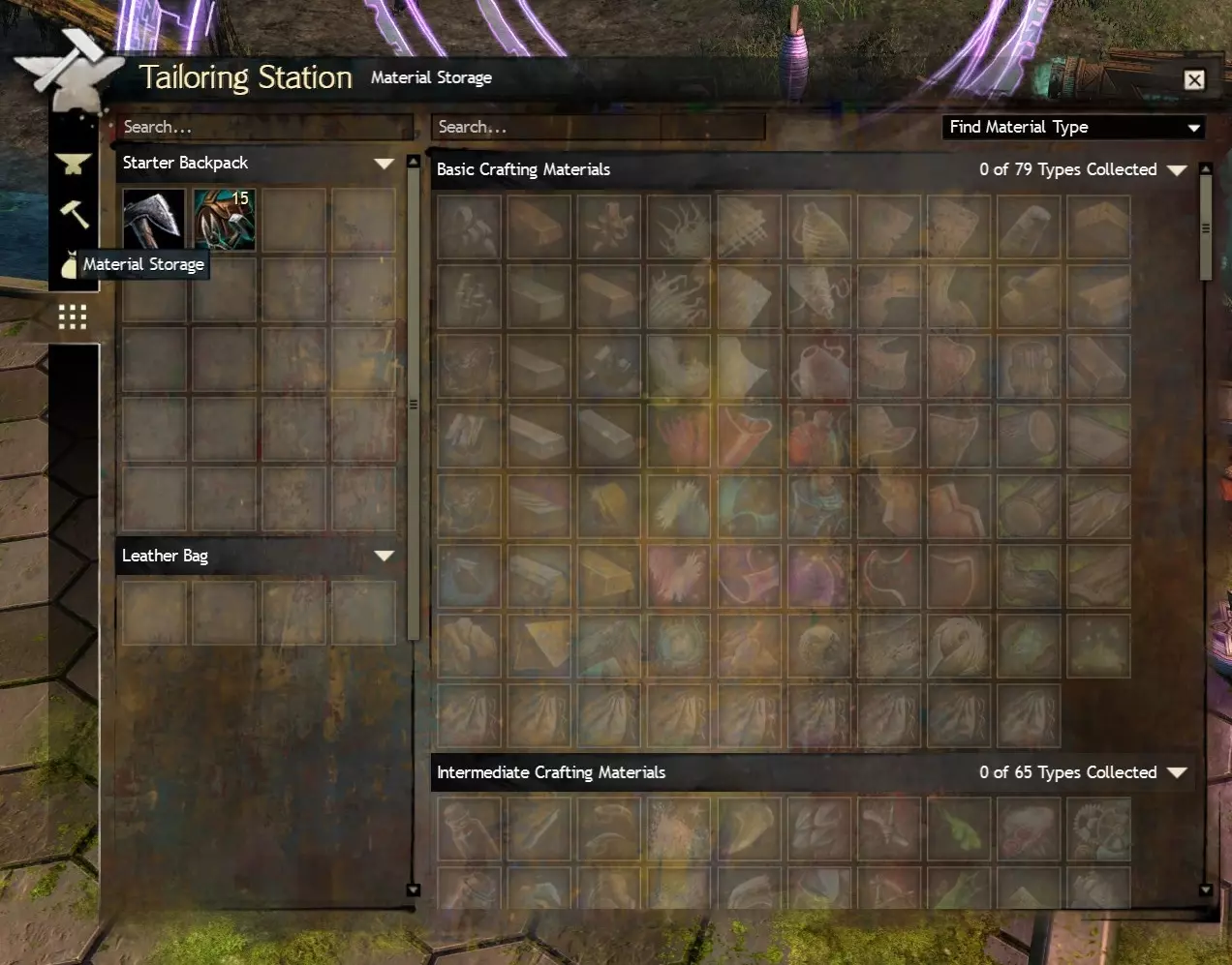 这些选项将分解你背包中所有指定品质的物品——精良(蓝色)及以下、优质(绿色)及以下或所有稀有(黄色)物品。它们永远不会分解【隐形背包】、【隐形包裹】或【保险箱】内的装备,也不会分解共享背包、银行或公会银行中的装备(即使你在分解时打开了这些窗口)。关闭背包会中断任何正在进行的分解操作。染料也会被分解,因此请使用、出售(交易行)或储存(隐形背包或银行)你不想失去的染料。我会在未鉴定装备部分再次提到这一点,但通常建议你这样设置:基础拆解工具或铜质自动拆解工具选择【拆解所有优质及以下品质装备】→符文匠拆解工具(或铜质自动拆解工具)选择【拆解所有精制及以下品质装备】→大师拆解工具、神秘拆解工具或银质自动拆解工具选择【拆解所有稀有品质装备】。 3.0 拆解与材料存放(第二部分) >3.1 - 拆解工具类型及用途 >3.2 - 拆解选项 >3.3 - 从背包中存放材料 >3.4 - 运气 >3.5 - 未鉴定装备 3.3 - 从背包中存放材料 远程将材料存入材料仓库的功能常被新手玩家忽视,而这一功能与拆解配合使用,能有效避免背包空间被占用。