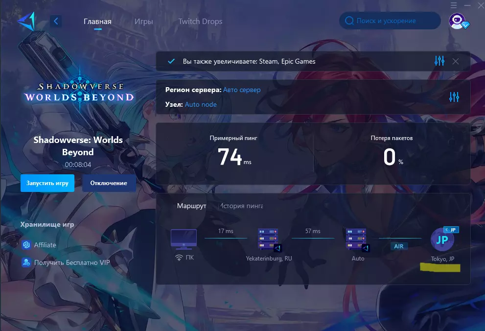 在俄罗斯游玩《影之诗》的简单方法! 修复说明 连接问题与俄罗斯地区Cloudflare故障有关。因此可以进入游戏,但对战时会出现问题。 手机上可以通过安装带有俄罗斯IP的VPN(如Beaver VPN)来修复。 我尝试用VPN在电脑上修复但未成功。发现了一款很棒的程序GearUp booster。该程序本质上会自动将你的游戏流量通过其服务器传输,提供尽可能好的延迟。在《影之诗》中我的延迟稳定在71,考虑到是日服,这已经是非常不错的结果了。我玩了3小时,一切都运行稳定!唯一的缺点是这个软件是付费的,每月大概250卢布,但在我看来是值得的,因为可以通过它运行任何游戏,我甚至成功进入了《战地5》!该软件有3天的免费试用。步骤说明 1. 下载gearUp 2. 完成注册,开通试用 3. 选择所需游戏,本示例中为【影之诗】