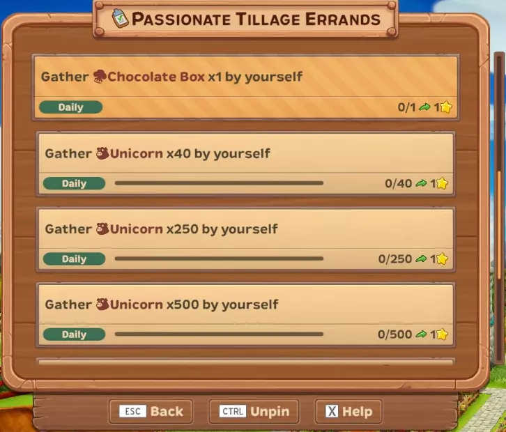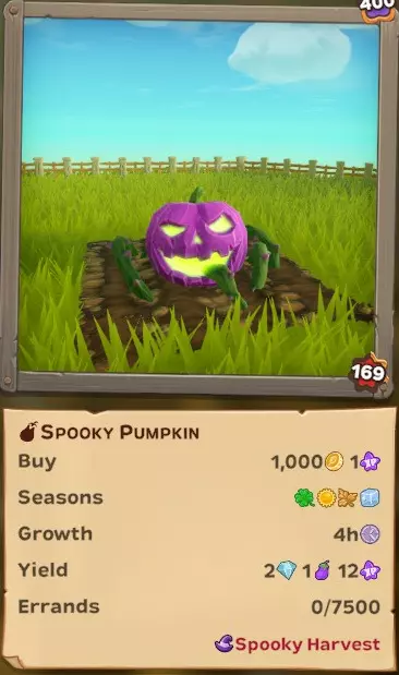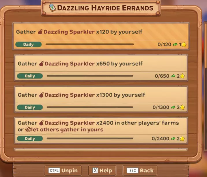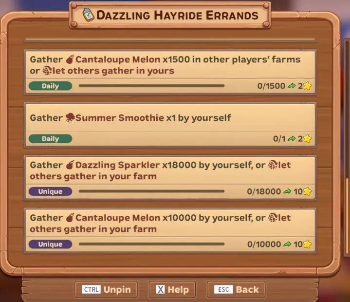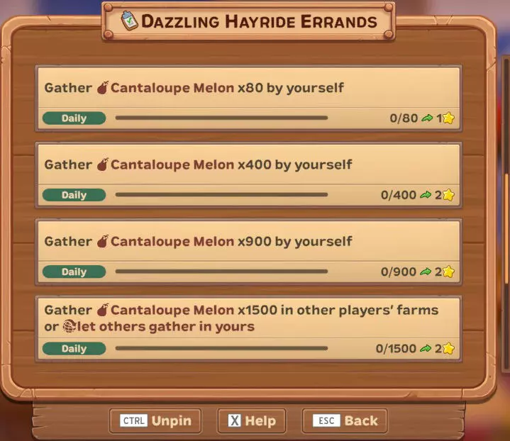 【每日】自行采集50个幽灵南瓜 【每日】自行采集250个幽灵南瓜 【每日】在其他玩家的农场采集100个幽灵南瓜,或让他人在你的农场采集 【每日】在其他玩家的农场采集500个幽灵南瓜,或让他人在你的农场采集 【每日】自行采集1个女巫猫画像 这是活动作物和另一个物品(画像)...