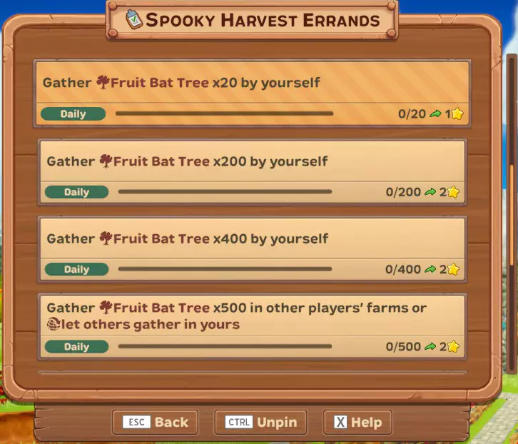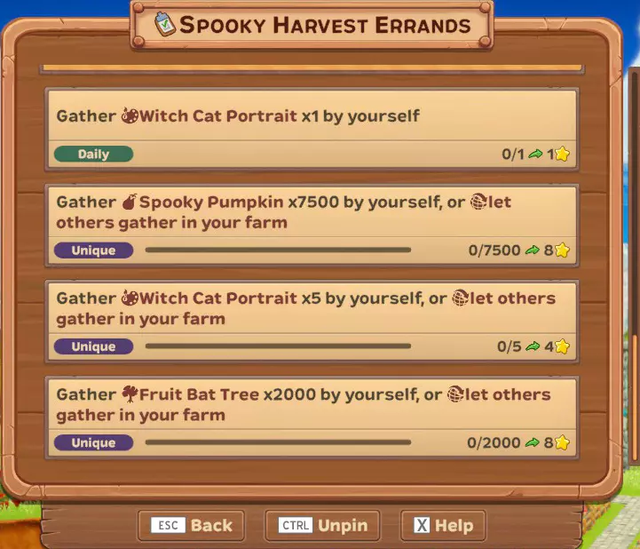 (每日)独自收集50个幽灵南瓜 (每日)独自收集1000个幽灵南瓜 (每日)独自收集1500个幽灵南瓜 (每日)在其他玩家的农场收集1750个幽灵南瓜,或让他人在你的农场收集 (每日)独自收集20棵水果蝙蝠树 (每日)独自收集200棵水果蝙蝠树 (每日)独自收集400棵水果蝙蝠树 (每日)在其他玩家的农场收集500棵水果蝙蝠树,或让他人在你的农场收集 (每日)独自收集1个女巫猫肖像 (唯一)独自收集7500个幽灵南瓜,或让他人在你的农场收集 (唯一)独自收集2000棵水果蝙蝠树,或让他人在你的农场收集 (唯一)独自收集5个女巫猫肖像 这些是活动作物、树木和其他物品(肖像)...