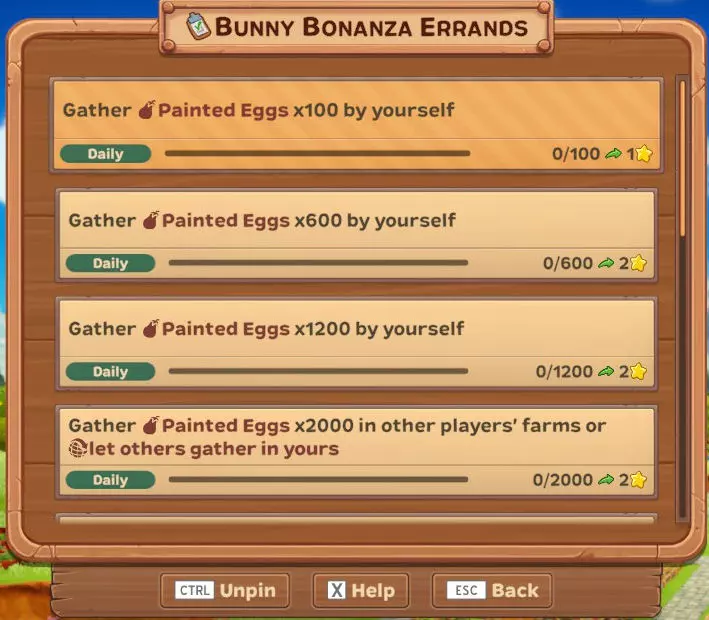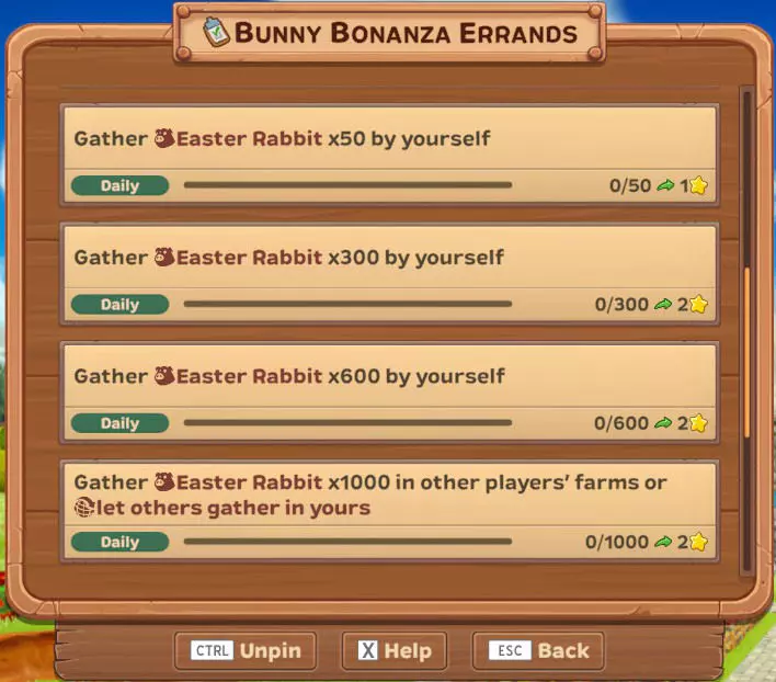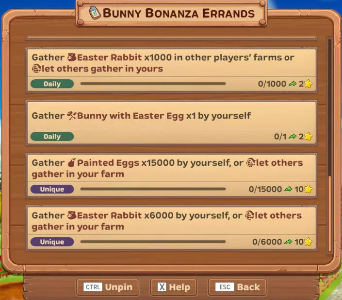 【每日】自行收集彩蛋×100 【每日】自行收集彩蛋×600 【每日】自行收集彩蛋×1200 【每日】在其他玩家的农场收集彩蛋×2000或让他人在你的农场收集 【每日】自行收集复活节兔子×50 【每日】自行收集复活节兔子×300 【每日】自行收集复活节兔子×600 【每日】在其他玩家的农场收集复活节兔子×1000或让他人在你的农场收集 【每日】自行收集彩蛋兔子×1 【唯一】自行收集彩蛋×15000或让他人在你的农场收集 【唯一】自行收集复活节兔子×6000或让他人在你的农场收集 活动作物、动物及雕像...