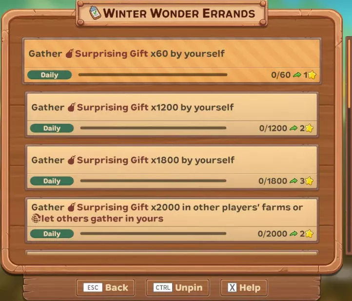 (每日)自行收集惊喜礼物×100 (每日)自行收集惊喜礼物×400 (每日)自行收集惊喜礼物×800 (每日)在其他玩家的农场收集惊喜礼物×800或让他人在你的农场收集 (每日)自行收集大理石一品红×100 (每日)自行收集大理石一品红×400 (每日)在其他玩家的农场收集大理石一品红×800或让他人在你的农场收集 (每日)自行收集姜饼曲奇×1 (唯一)自行收集惊喜礼物×5000或让他人在你的农场收集 (唯一)自行收集大理石一品红×5000或让他人在你的农场收集 活动作物、花卉及食谱...