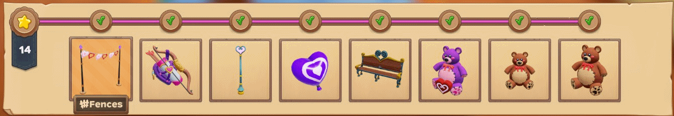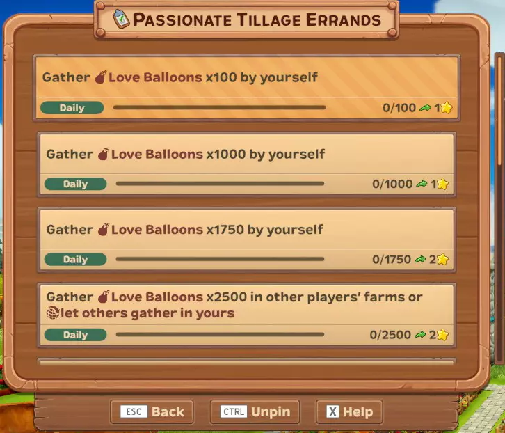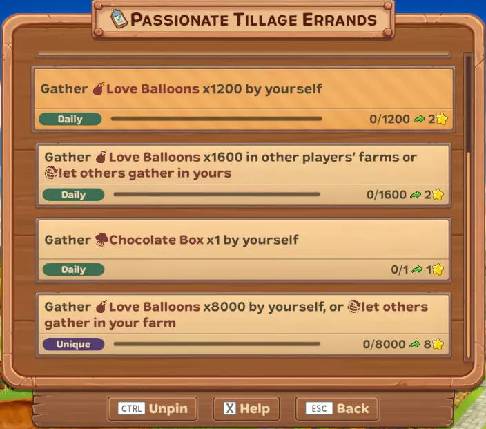 (每日)独自收集爱心气球x100 (每日)独自收集爱心气球x1000 (每日)独自收集爱心气球x1750 (每日)在其他玩家的农场收集爱心气球x2500,或让他人在你的农场收集 (每日)独自收集巧克力盒x1 (每日)独自收集独角兽x40 (每日)独自收集独角兽x250 (每日)独自收集独角兽x500 (每日)独自收集独角兽x800,或让他人在你的农场收集 (唯一)独自收集爱心气球x20000,或让他人在你的农场收集 (唯一)独自收集独角兽x5000,或让他人在你的农场收集 活动作物、配方及动物...