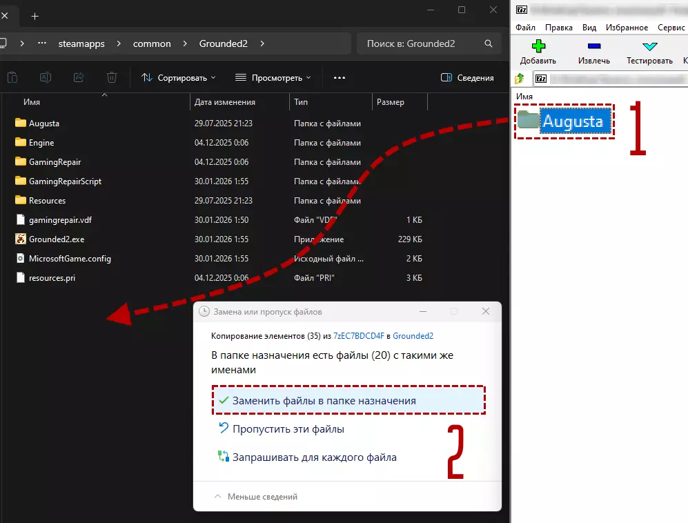 下载链接 请通过以下任一便捷链接下载压缩包: 来自VK社区 来自Playground 来自NexusMods 安装说明 方法1:自动更新(推荐) 此方法包含一个模块,该模块将在游戏启动时检查是否有新版本并提示更新 下载压缩包“Grounded 2 俄化补丁”将压缩包中的Augusta文件夹移动到游戏根目录(即Grounded2.exe所在的文件夹) 如提示,确认替换文件 在游戏中进入选项>游戏>界面语言,选择“English / Russian”