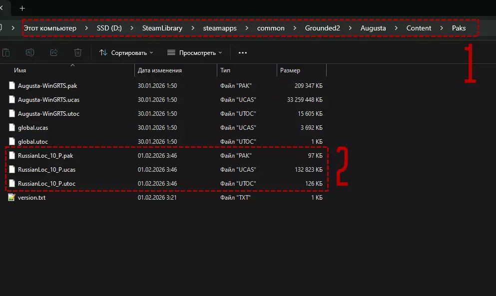 方法2:仅安装汉化补丁 此方法仅安装翻译文件,不自动检查更新。 前往Grounded2 Augusta Content Paks文件夹,确保其中不存在其他汉化补丁文件,如Augusta-WinGRTS_9999_P.pak、Augusta-WinGRTS_9999_P.ucas和Augusta-WinGRTS_9999_P.utoc。如果存在,请将其删除 在压缩包中进入Augusta/Content/Paks文件夹并复制3个翻译文件 将它们粘贴到游戏目录下的Grounded2/Augusta/Content/Paks文件夹中 在游戏中进入选项>游戏>界面语言,选择【English / Russian】 删除本地化文件 进入Grounded2/Augusta/Content/Paks路径,删除名为RussianLoc_10_P.pak、RussianLoc_10_P.ucas和RussianLoc_10_P.utoc的三个文件