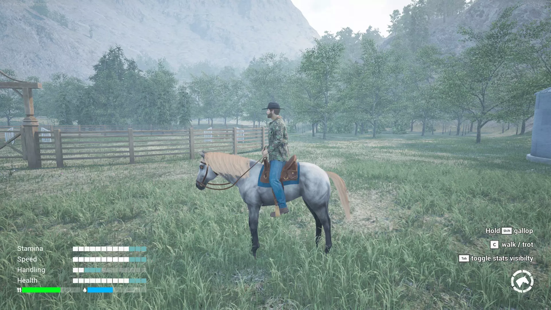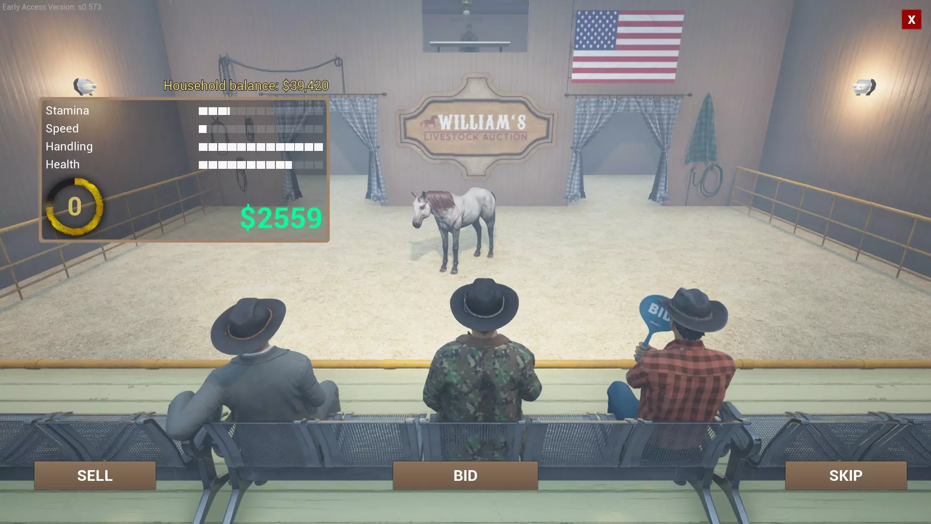 马匹与游戏中的其他动物截然不同。你无法在牧场的任何商店购买它们,只能在牧场附近的拍卖行获取,前往拍卖行需要花费50美元。 到达拍卖行后,你会看到许多不同颜色和技能的马匹。(拍卖行显示的技能是马匹完全训练后的状态——你获得的是未经训练的马匹)