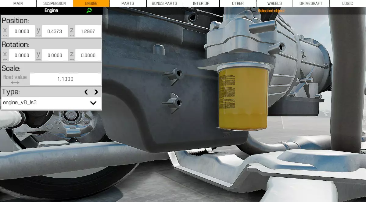 引擎与排气系统 降低悬架后,需要调整引擎,以避免后轮驱动(RWD)车辆的引擎与悬架框架发生碰撞,或确保前轮驱动(FWD)和全轮驱动(AWD)车辆的传动轴能够适配。 取消勾选【显示车身】选项,以便透视车身,四处移动并寻找可以查看是否存在碰撞的位置。 在顶部选择【引擎】部分来编辑其参数,大多数情况下,仅调整【Y轴】即可,但具体取决于每辆车和引擎的情况。