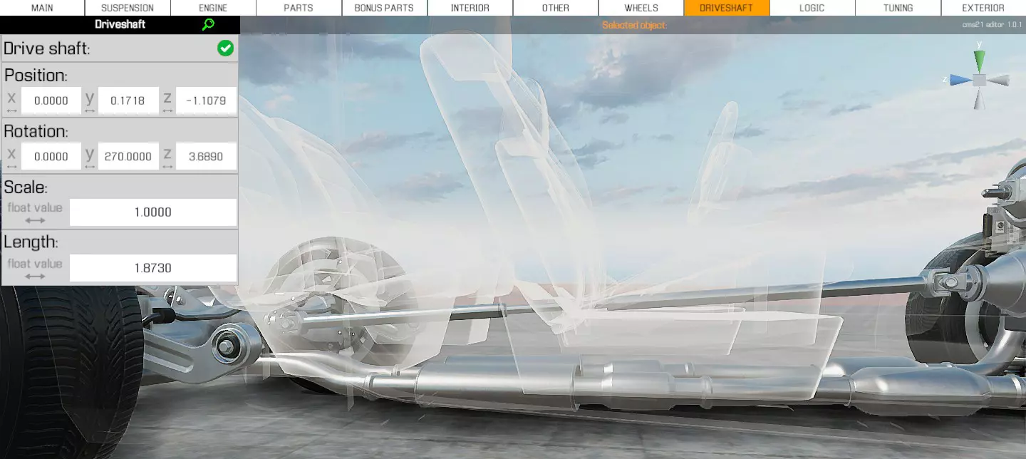 传动轴 在 rear-wheel drive(后轮驱动)和 all-wheel drive(全轮驱动)车辆中,你需要对传动轴进行同样的操作。 在顶部菜单中选择【传动轴】,然后使用其【Z 旋转轴】调整高度和倾斜度,以适配变速箱和差速器。