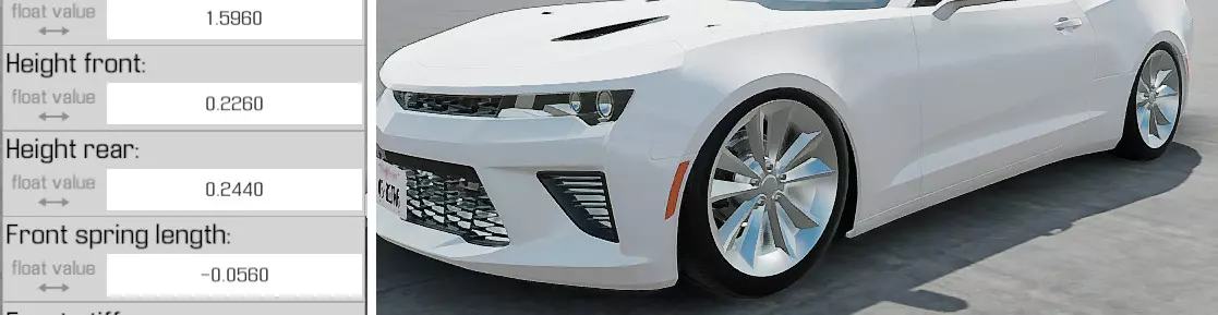 现在,你可以开始调整车辆的悬挂了: 悬挂 只需选择顶部的【悬挂】选项卡,然后向下滚动,直到找到【高度】调节项。 前后高度会改变车身离地高度。 调整到满意的数值后,你需要调整前弹簧长度以适应新的高度。