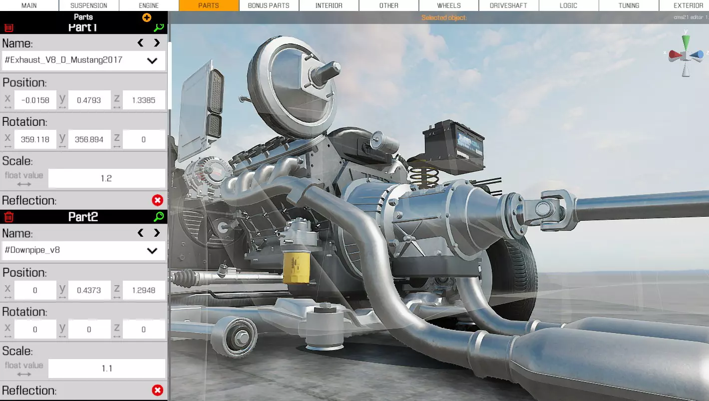 排气管的原理相同,只需调整高度以适应新发动机的高度。前往【零件】界面,调整所有与排气系统相关的部件。