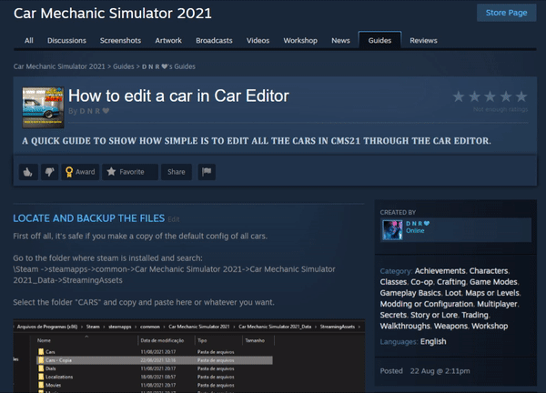 WORKSHOP指南 找到并备份文件 首先,建议你复制所有车辆的默认配置文件以确保安全。 前往Steam的安装文件夹,依次打开: Steam -> steamapps -> common -> 汽车修理工模拟2021 -> Car Mechanic Simulator 2021_Data -> StreamingAssets 选中【CARS】文件夹,将其复制并粘贴到你想要的位置。