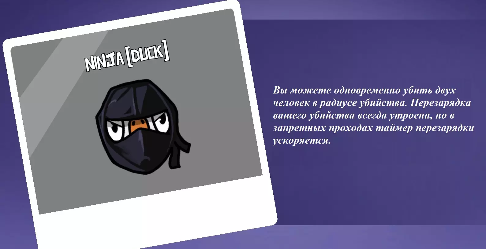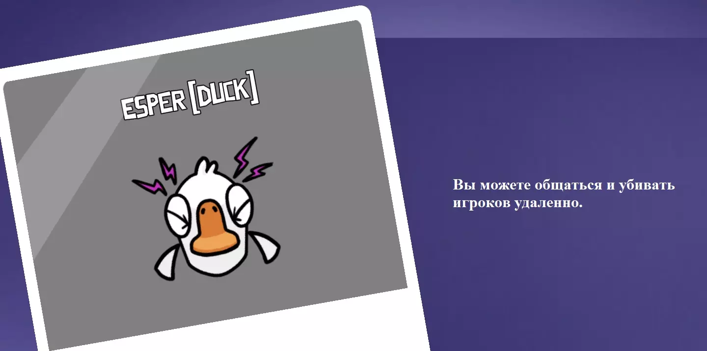 你是一只鸭子。你的能力是可以隐身5秒。隐身期间你的速度会提升,并且可以在不中断技能效果的情况下进行击杀。主要难点在于,隐身时你无法看到其他玩家,只有当“击杀按钮”亮起时才能进行击杀。除此之外,还有一个【漏洞】(现已修复),即尽管你处于隐身状态,但部分玩家仍能看到跟随你角色飞行的宠物。看着宠物高速飞向别处做自己的事,感觉非常有趣。