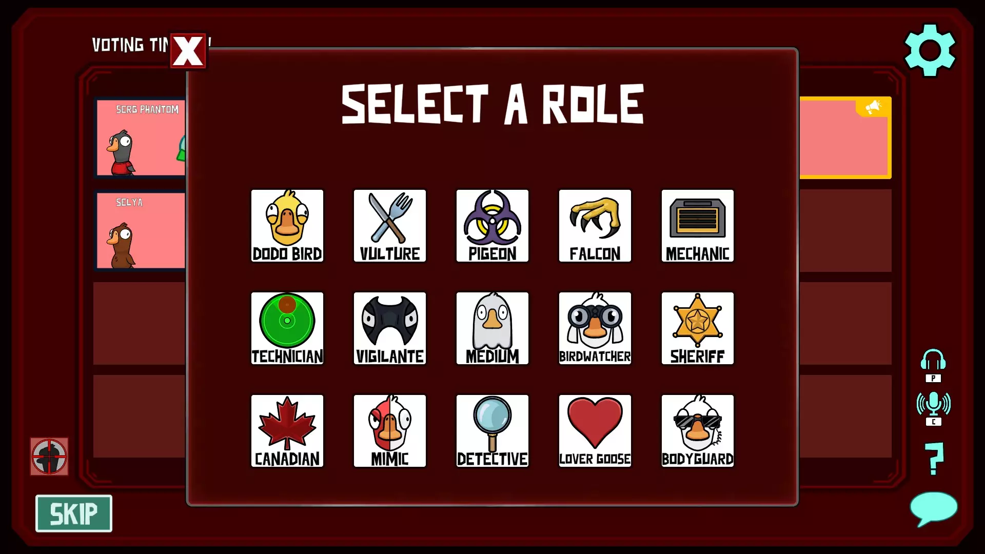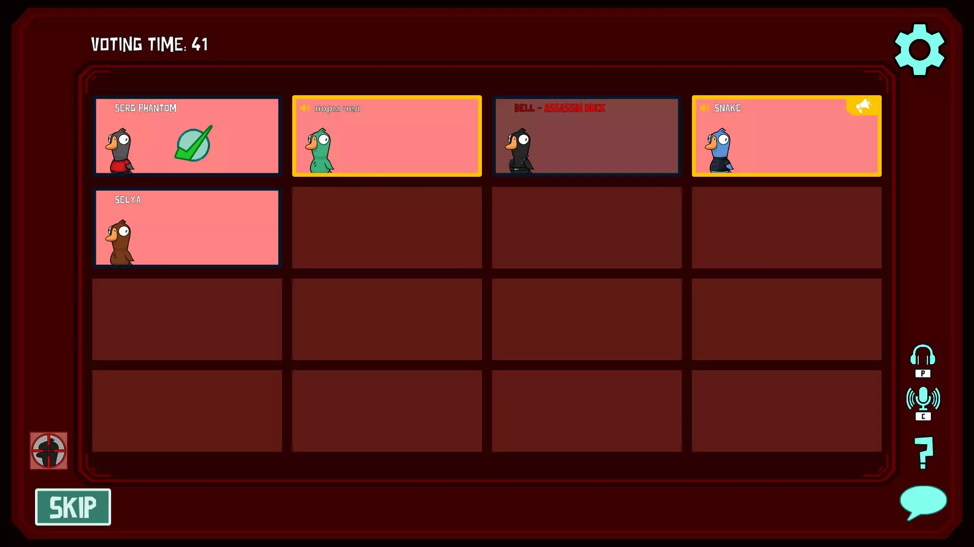你是叛徒。你的技能是在游戏中可以在投票阶段杀死玩家2次(一次投票阶段只能杀一名玩家)。在投票阶段,你可以尝试猜测另一名玩家的角色。如果该玩家的角色与你选择的角色一致,那么该玩家将在投票阶段死亡。如果你选择的角色与该玩家的角色不符,那么你将死亡。你在游戏中的任务是找出每个人的角色,并在投票阶段进行击杀(这样就没人会怀疑你了)。 如何击杀: 步骤1. 按下技能按钮(技能按钮仅在投票阶段激活)