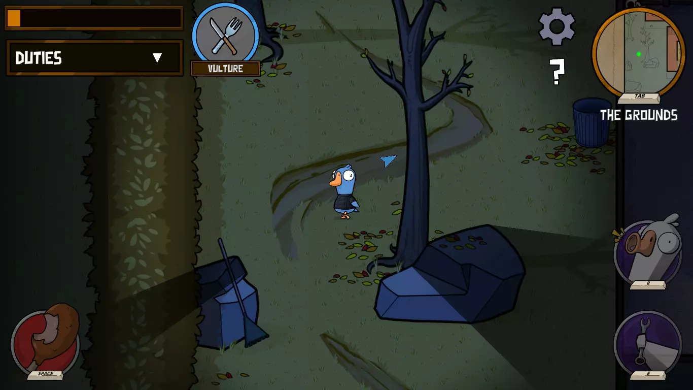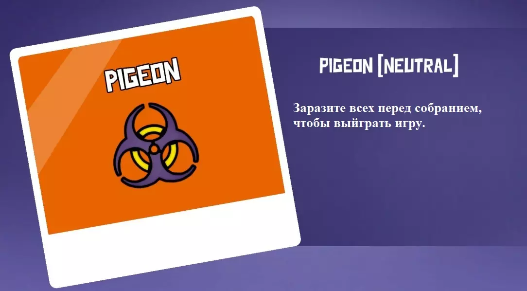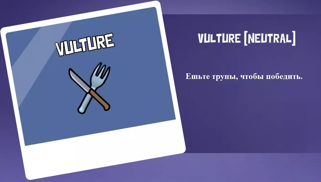 你不是叛徒,也不是和平主义者。你只为自己而战!你的任务是在一回合内感染地图上的所有玩家。如果在回合内你感染了除一名玩家外的所有人并开始了会议,那么如果你没能感染的那名玩家在投票中被踢出,你就会获胜。尽量追踪你感染了谁,因为没有视觉显示,但这不会让你在同一回合内两次感染同一个人。上一回合感染的玩家需要重新感染。玩家越多,扮演白鸽就越难,但地图上每多一具尸体就会变得更容易。可以使用通风管道和躲进柜子。 秃鹫