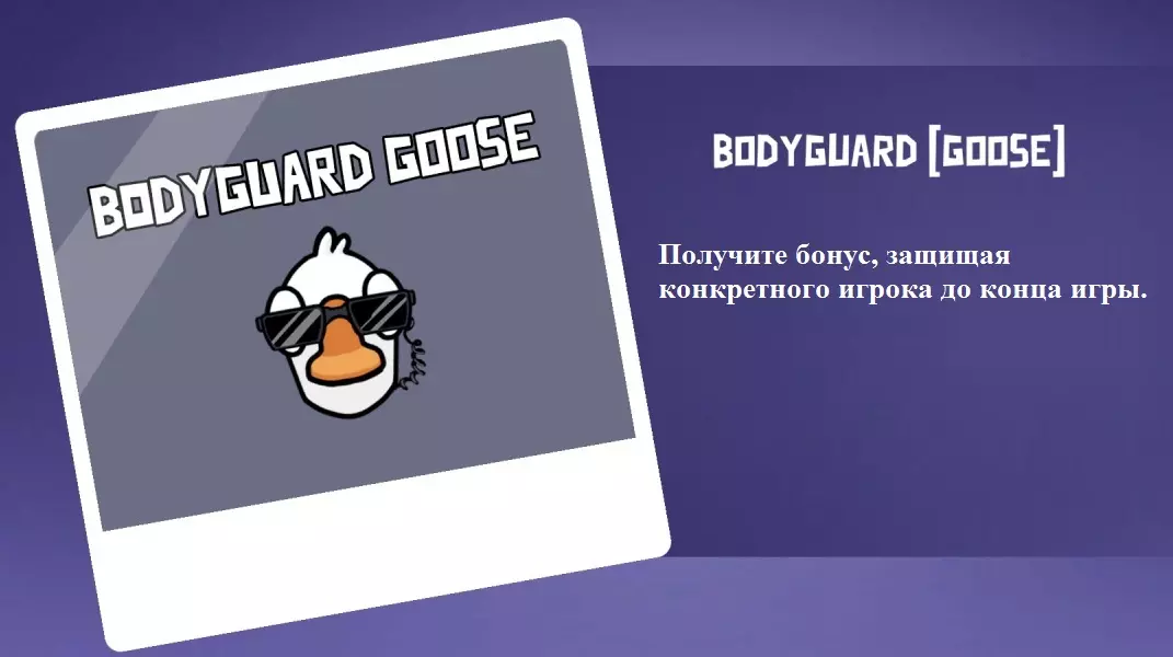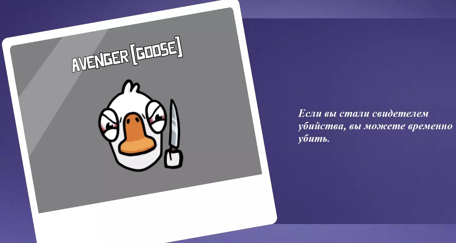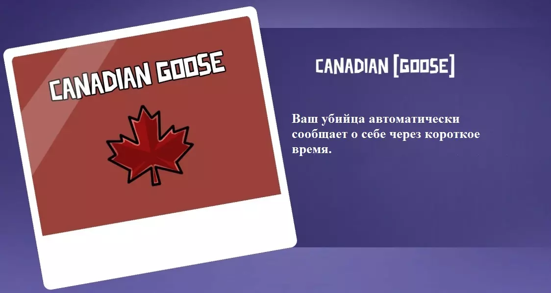 你是和平玩家。你的特点是一旦有人杀死你,他会自动向所有人报告发现的尸体(【职业杀手】除外,因为他无法报告自己制造的尸体)。你可以分享这条信息,也可以将其保密。如果至少有一名和平玩家知道你是【加拿大鹅】,那么这将有助于在你死后立即排除一名内鬼。