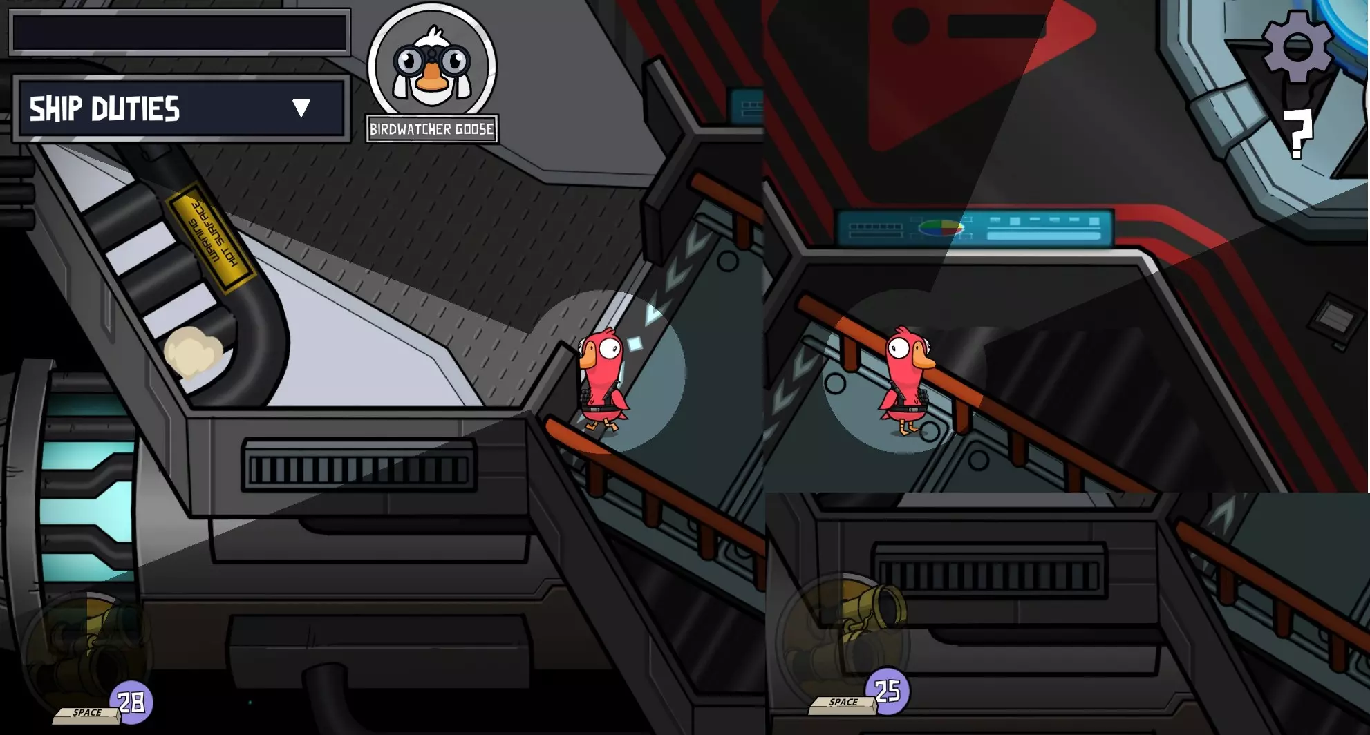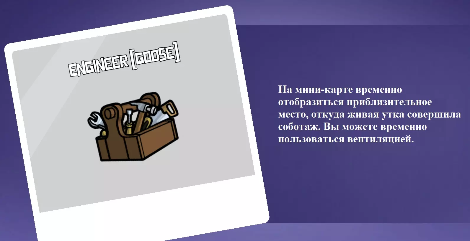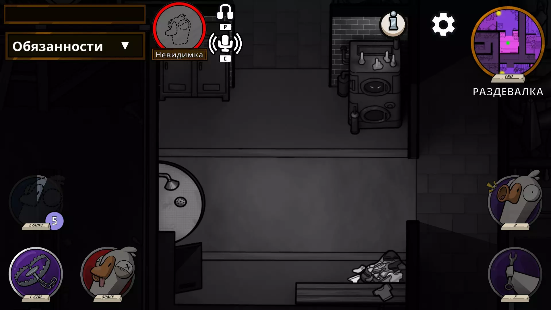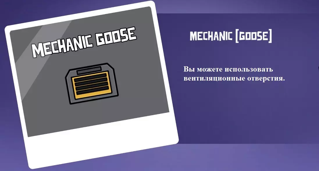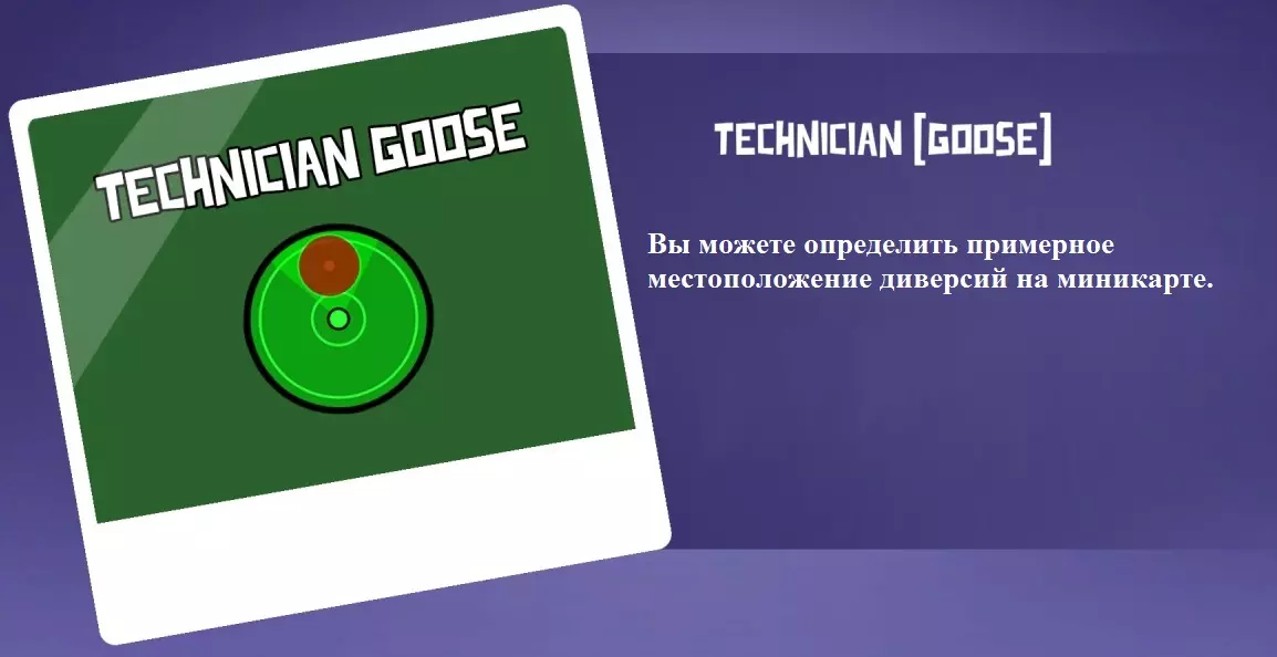 你是一名具有两项特殊能力的和平玩家。 1. 你可以在通风管道中躲藏10秒。当你处于通风管道内时,你的视野范围会缩小。 1.1 你可以在【窥探者】之前能够躲藏的位置进行躲藏,且可无限时间停留,同时你的视野范围会扩大。 2. 你的小地图上会显示活鸭进行破坏的大致位置。已修复死亡野鸭的破坏行为不显示的问题。 技术员野鸭