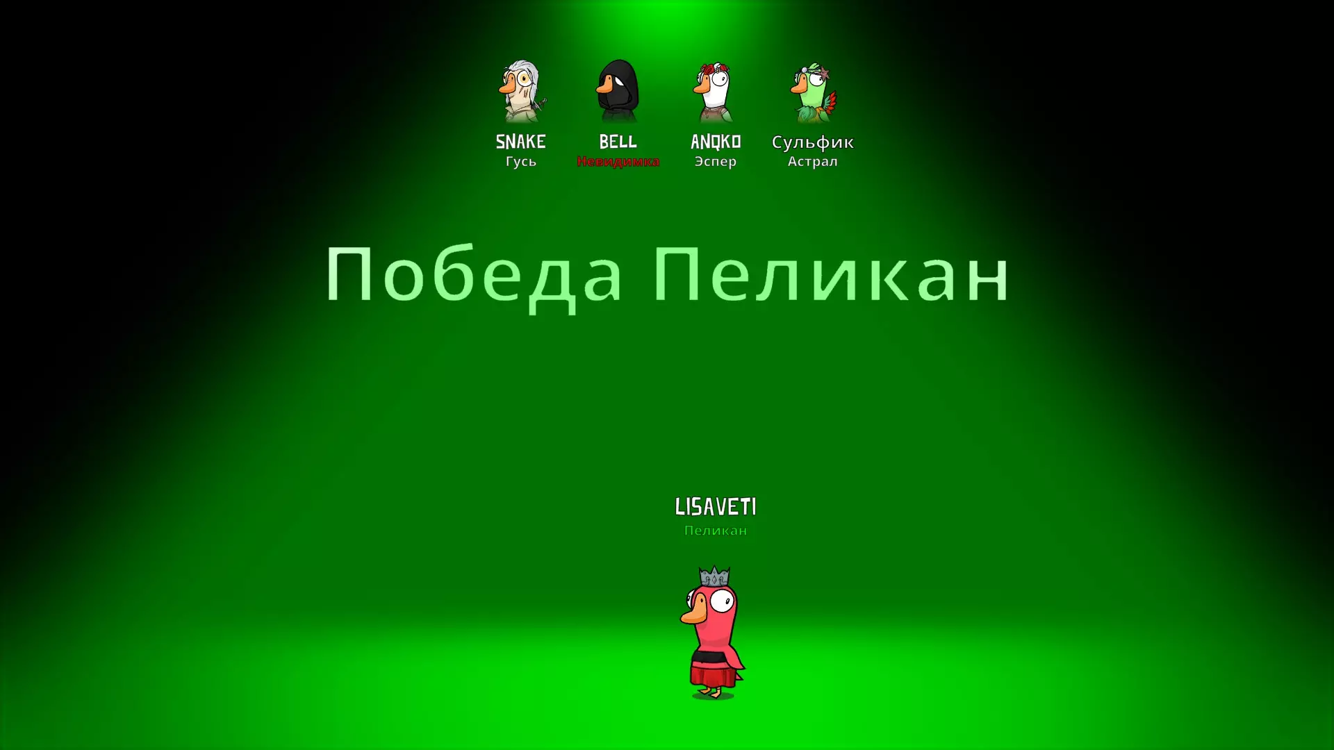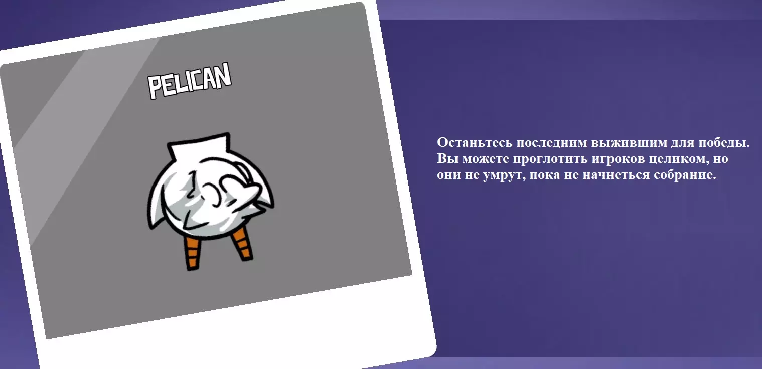 你是中立角色。你的任务是成为最后一个存活的玩家。你可以吞噬其他玩家,但他们在紧急会议召开前仍然算作存活状态。每吞噬一个新的“住户”,你的技能冷却时间就会增加5秒。如果是在私人房间中游玩,被你吞噬的玩家可以发出声音并相互交流,而你能听到所有声音,也可以与他们交谈。被鹈鹕吃掉的玩家只能被鹈鹕本身和其他被它吃掉的玩家听到。如果你试图吃掉胖子,而他旁边还有另一名玩家,那么胖子会躲到该玩家身后,从而避免被你吞入腹中。如果在你的肚子里有玩家时你被击杀,那么所有在你肚子里的玩家都会逃脱出来。但如果发布紧急集合,所有被你吞噬的玩家都会死亡。当地图上还剩3名玩家,其中包含存活的鹈鹕,且其他玩家要么死亡、要么处于鹈鹕腹中时,将开始鹈鹕的胜利倒计时。若倒计时期间鹈鹕死亡,其腹中的玩家得以逃脱,则倒计时终止。如果被鹈鹕吃掉,除了内鬼的破坏能力外,你的所有能力都会被禁用,视野范围也会缩小。如果鹈鹕吞下加拿大鹅,加拿大鹅会立即死亡,并且鹈鹕会对此进行通报。如果鹈鹕吞下手持炸弹的鹅,那么在计时器结束时鹈鹕会死亡,至于炸弹原持有者和被吞下的角色会怎样,目前尚不清楚!该角色现在也可在所有地图上使用。