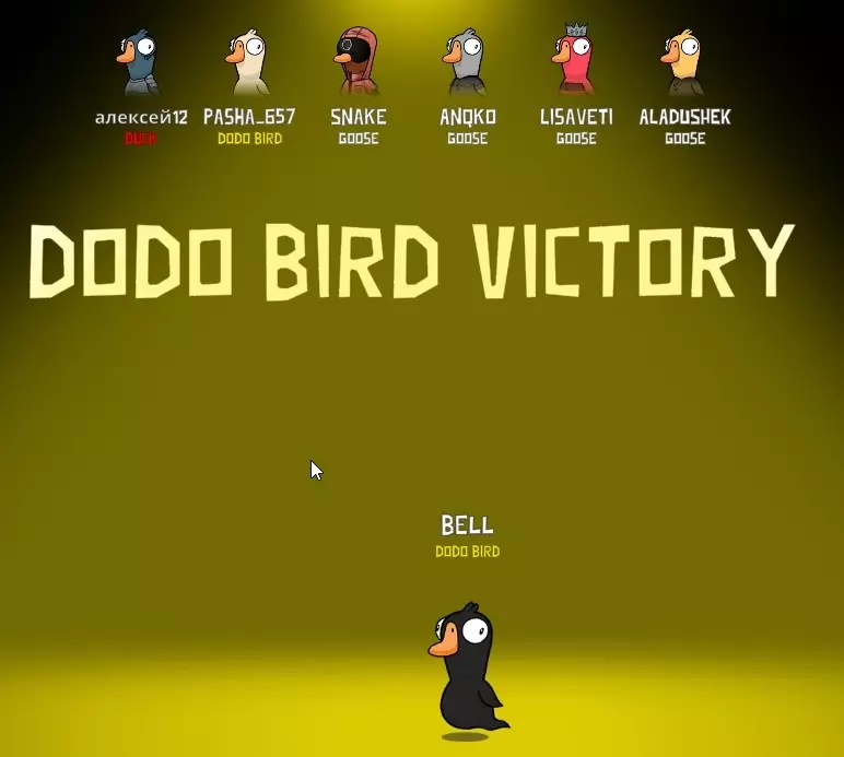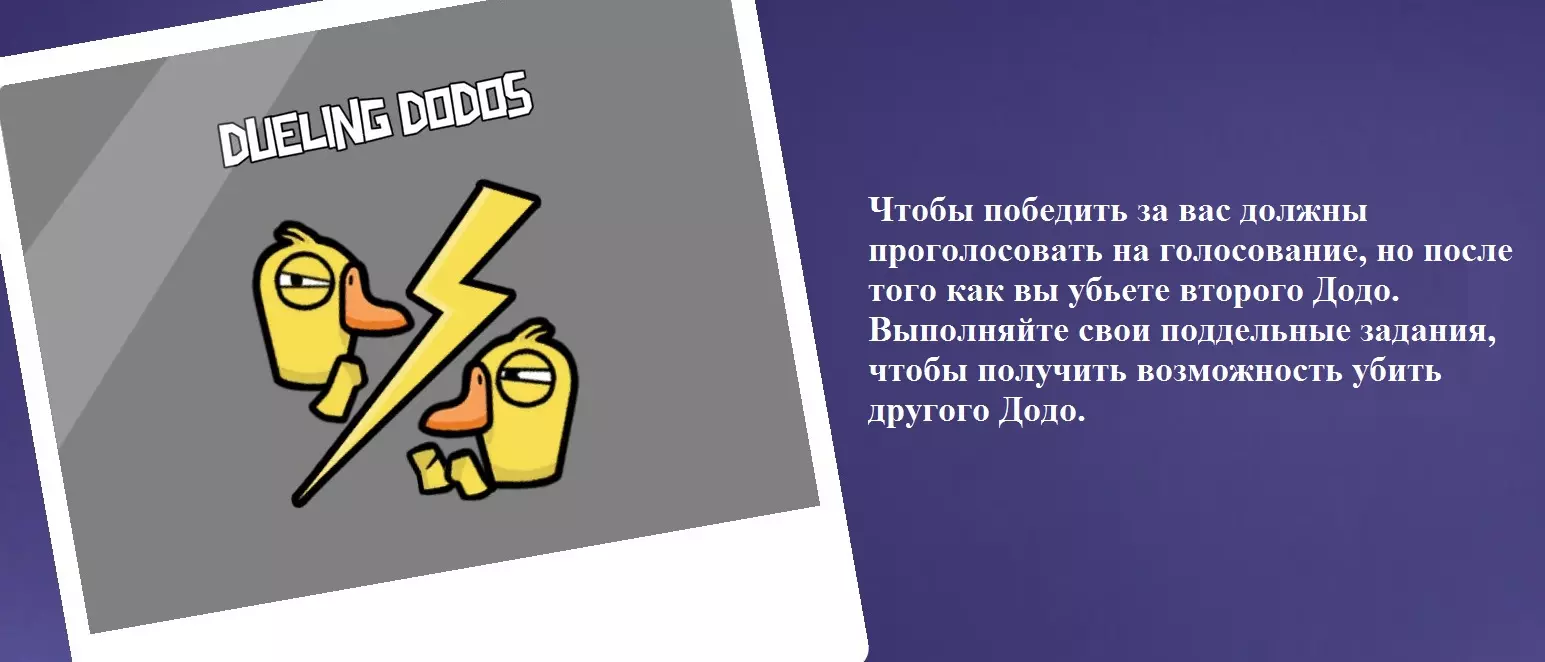 你既不是和平者也不是背叛者,你在游戏中的任务是杀死第二个渡渡鸟,然后退出并进入投票环节。每个渡渡鸟都有虚假任务需要完成,完成这些任务后才能获得杀死对手的机会。完成最后一个任务后,屏幕上会出现一个箭头,该箭头会指向需要杀死的第二个渡渡鸟。如果其中一名决斗者因任何原因死亡,另一名决斗者将变成普通渡渡鸟。