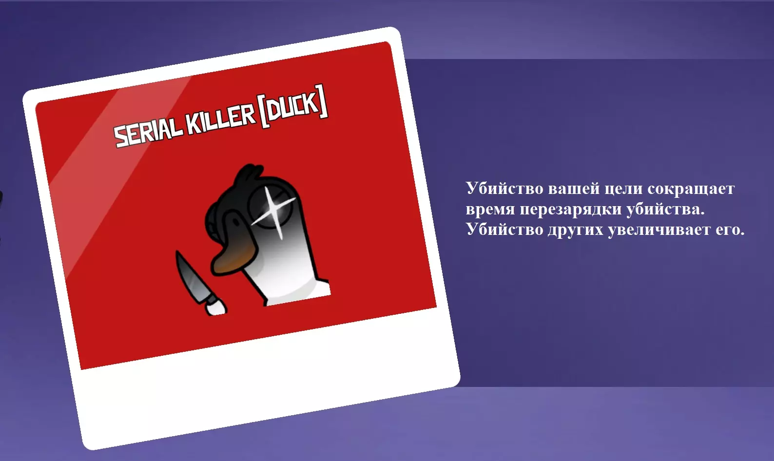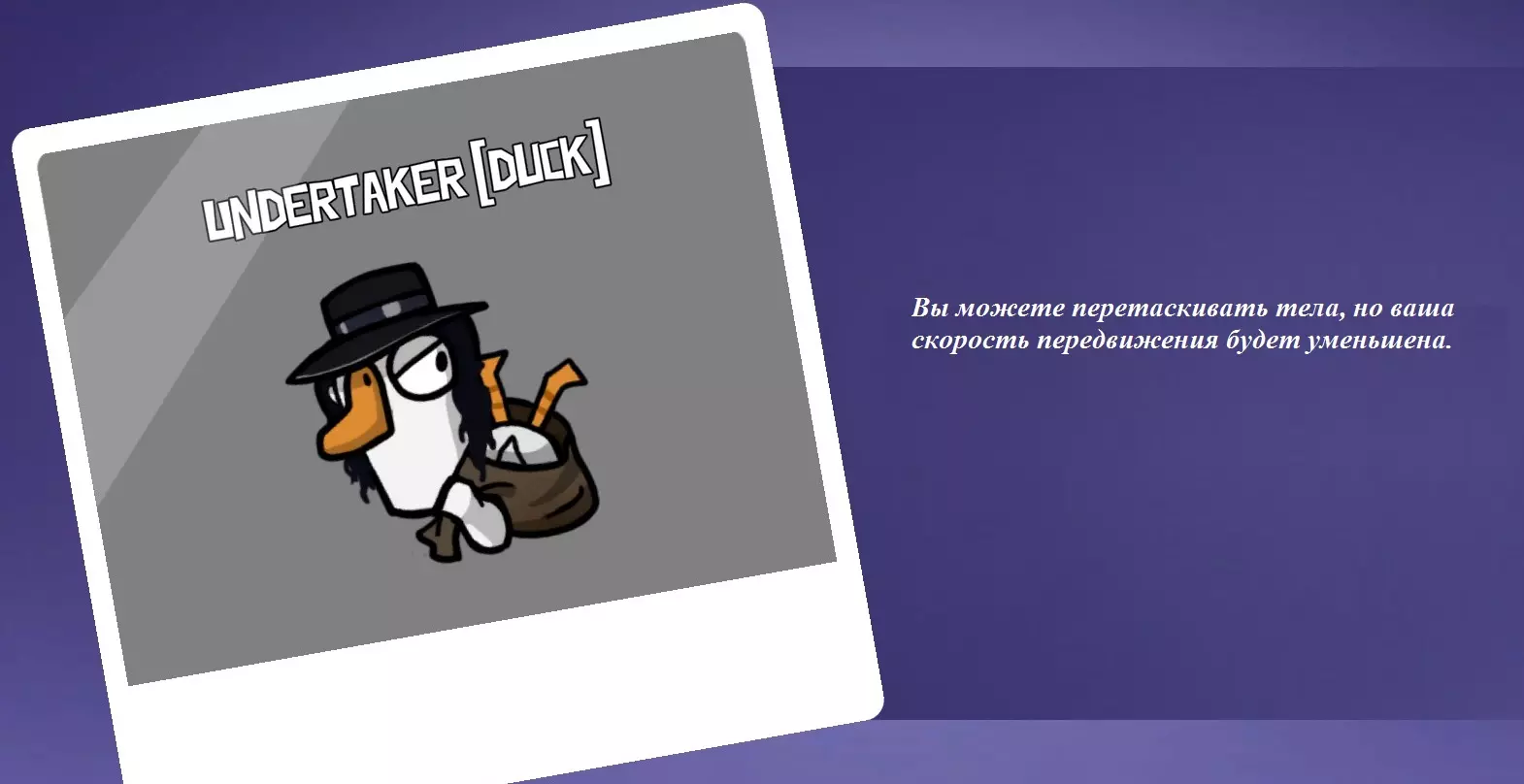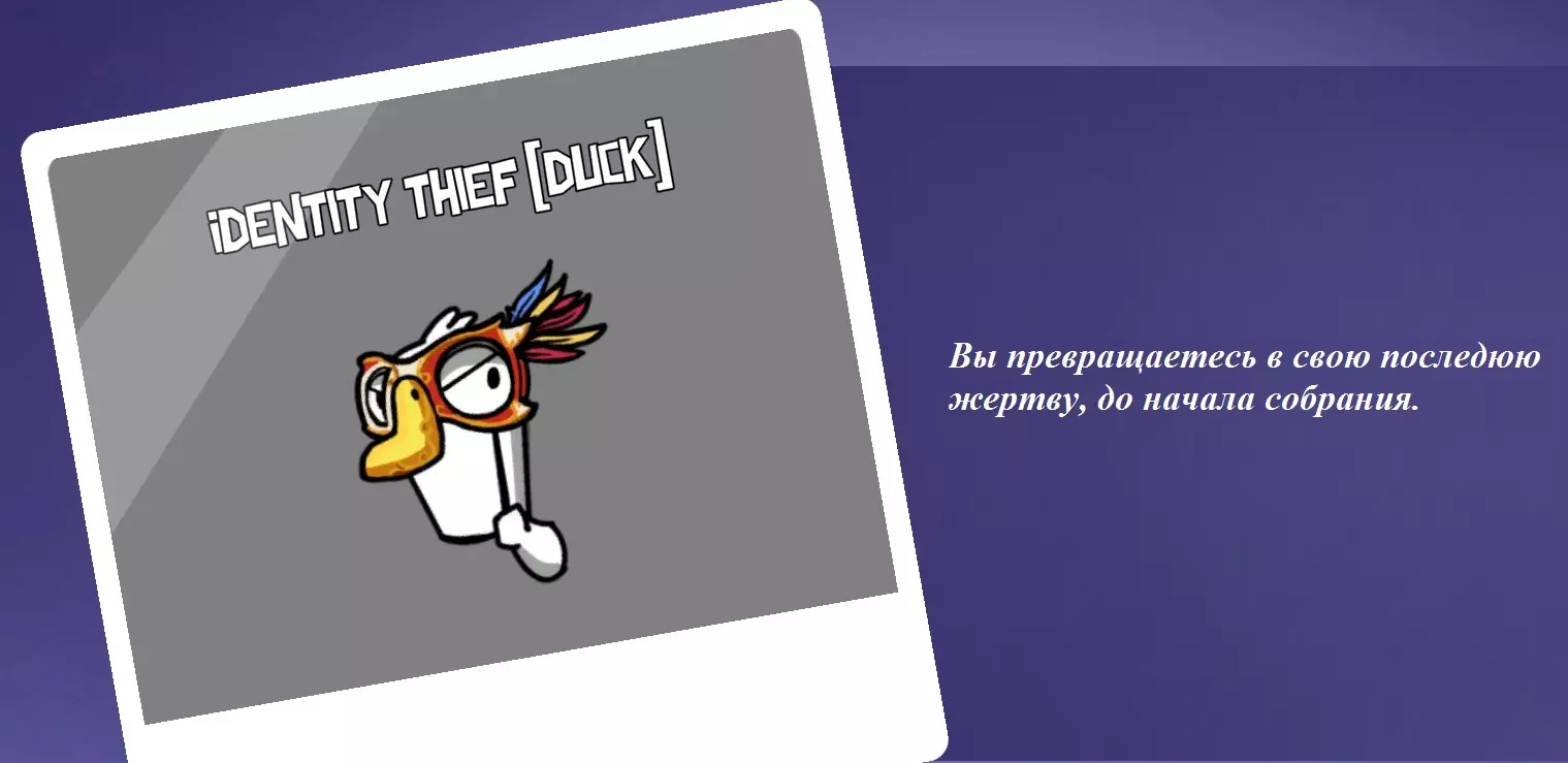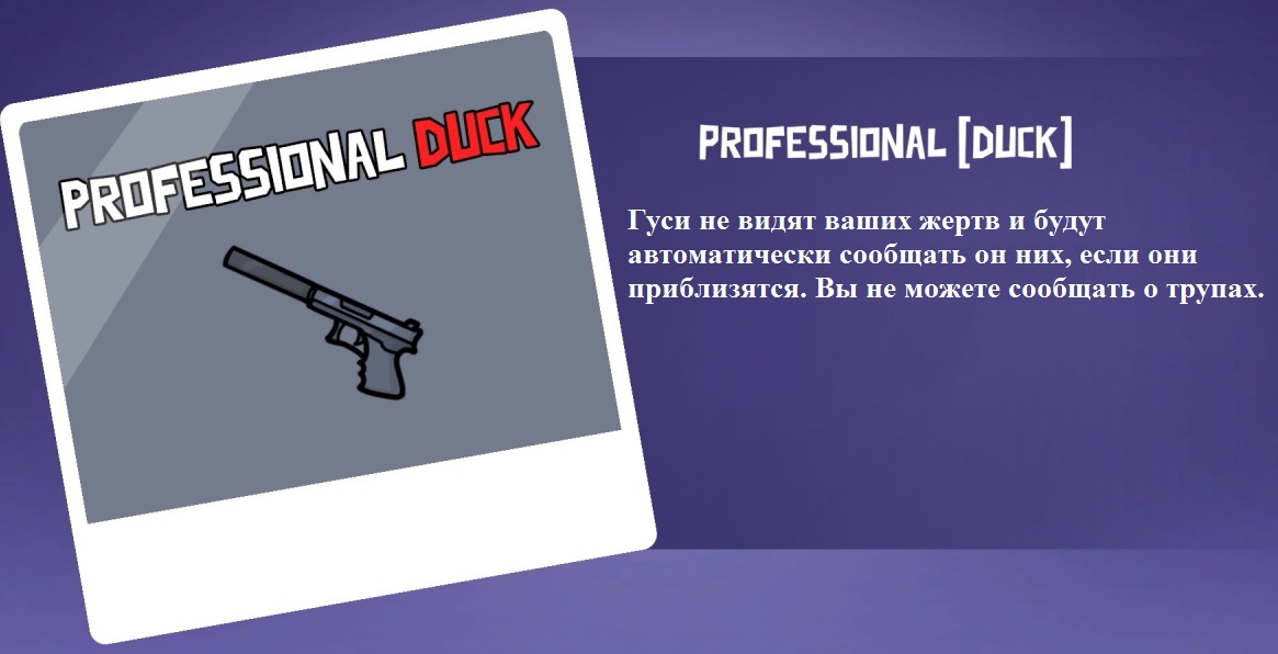 你是叛徒。你的角色特点是,平民玩家无法看到你留下的尸体。但部分中立角色(渡渡鸟、拾荒者等)可以看到你的尸体。此外,你不能报告自己留下的尸体。职业杀手不会承认自己杀了加拿大鹅。当玩家靠近你杀人的地点时,他会自动向所有人报告发现的尸体。你的能力让你无需花时间在隐蔽处寻找受害者,你可以在房间中央杀人,尸体甚至可能不会被发现。 《杀手》