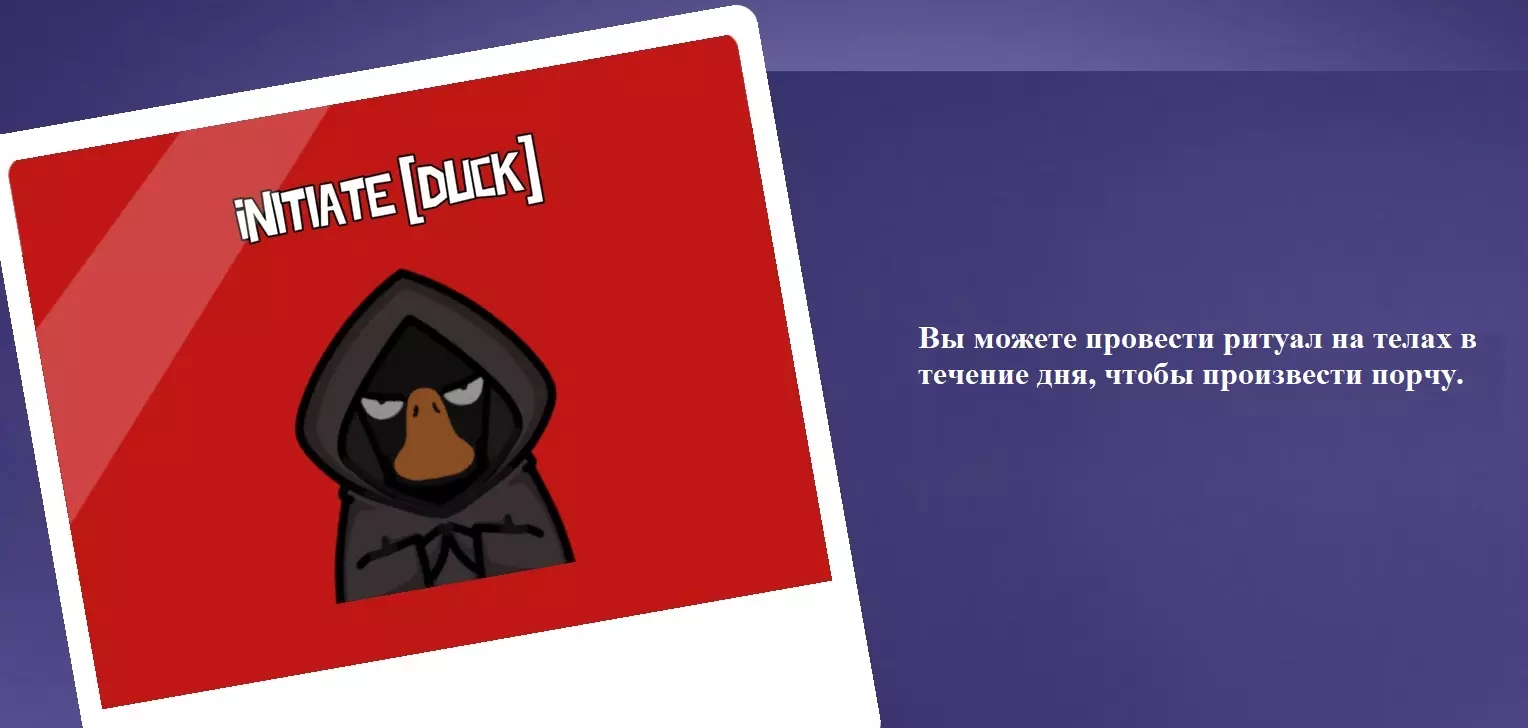 你是叛徒。你的游戏目标是杀死所有和平玩家和中立玩家。游戏开始时,地图上会有可以进行 sabotage(破坏)准备的地点,准备完成后,按下Ctrl键即可从地图任意位置激活破坏。积极使用破坏技能对获胜起着重要作用。 CANNIBAL DUCK