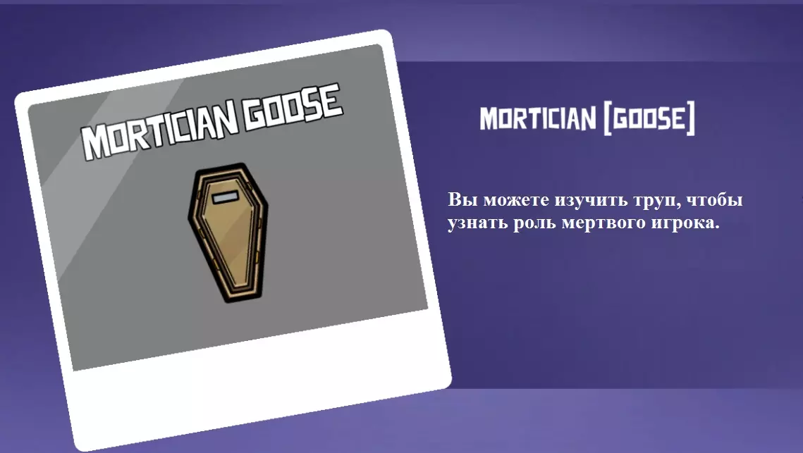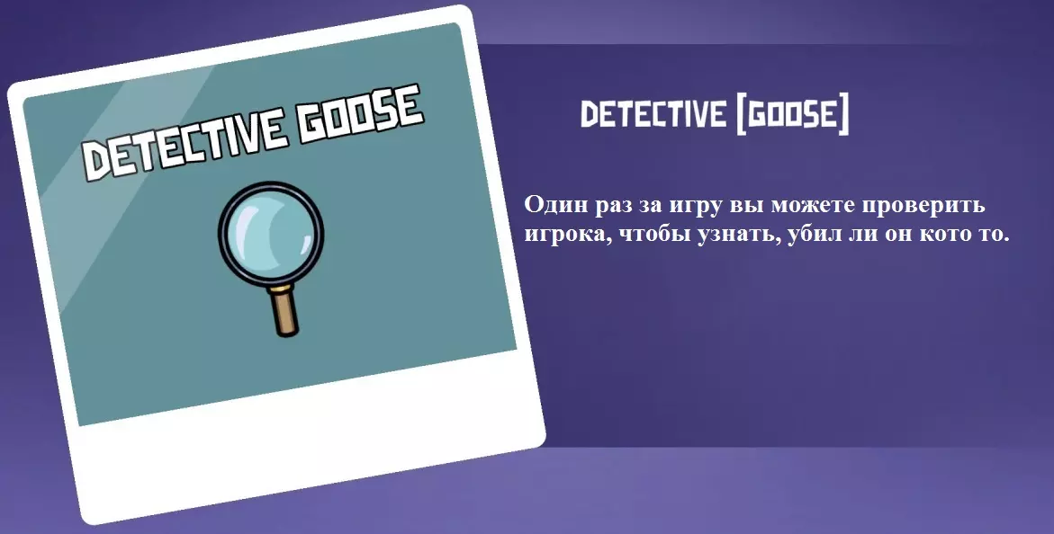 你是和平阵营。你在游戏中的角色是寻找死去的鹅的尸体并检查它们的身体。当你靠近尸体时,你可以使用你的技能。