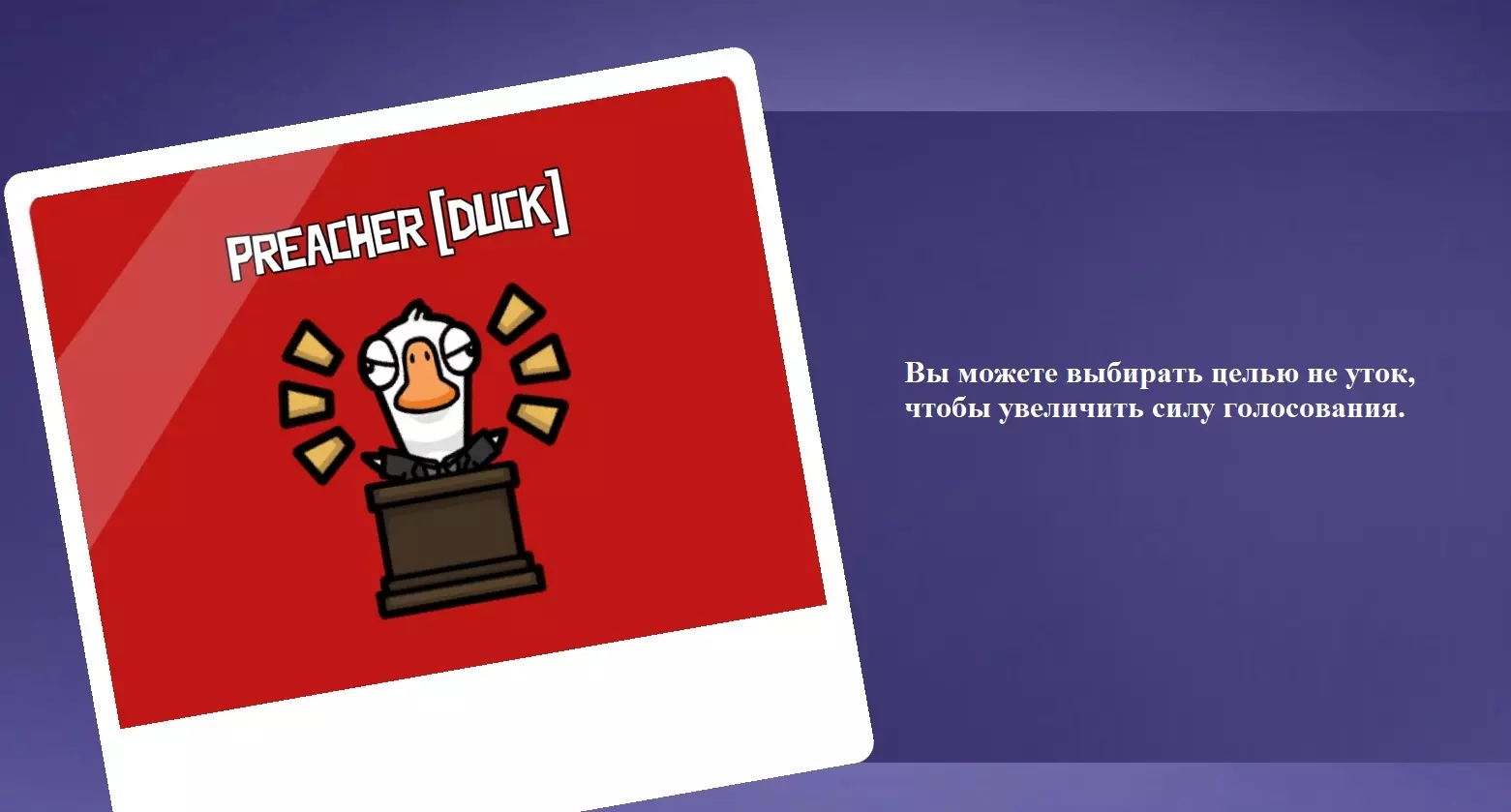 你是和平玩家。你的特殊能力是:如果桌上有两人获得相同数量的票数,那么被政治家投票反对的人将被淘汰。叛徒无法将你关进监狱。 告密鸭