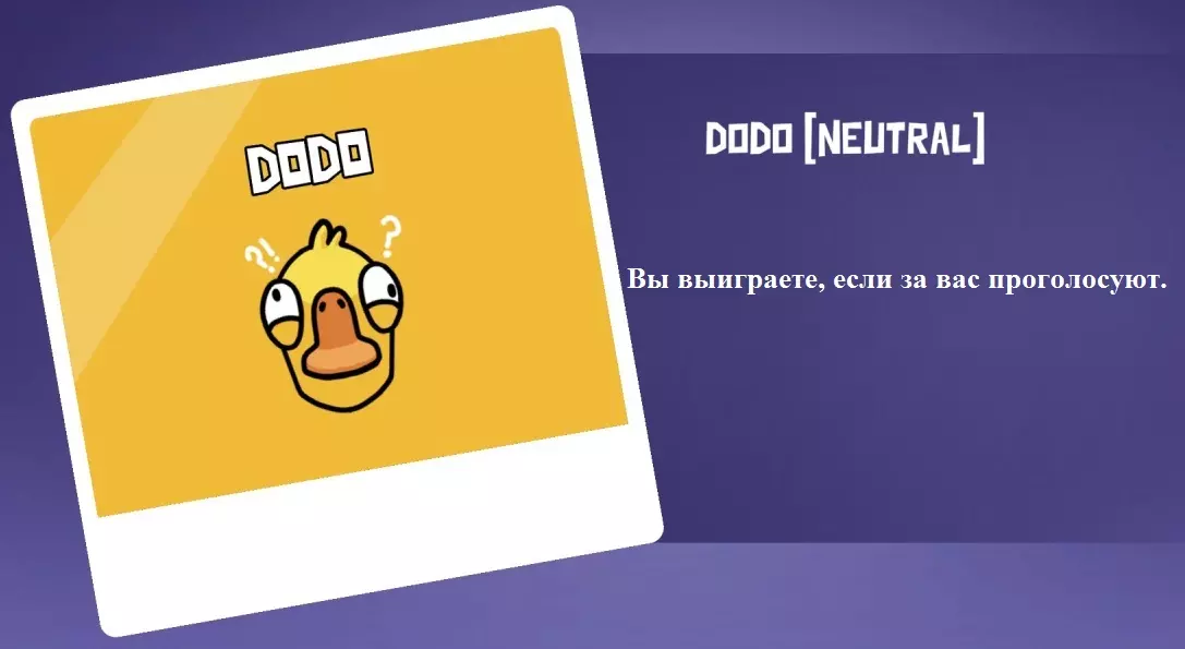 你不是叛徒,也不是和平主义者。你只为自己而战!你的胜利只取决于你和你的演技。渡渡鸟是一个复杂的角色,因为你必须表现得足够可疑,让其他玩家想要投票淘汰你,但如果你明显表现出希望被投票淘汰,他们就会发现你是渡渡鸟。 决斗渡渡鸟