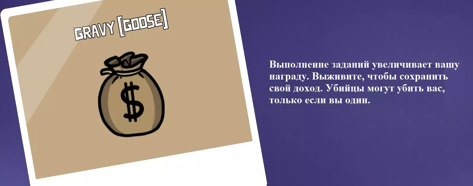 你是一名和平玩家。你在这款游戏中的任务是完成任务。随着任务的完成,你会获得奖励金币。如果你能存活到游戏结束,这些奖励将作为额外金币在游戏结束时计入。请注意,完成几个任务后,叛徒会看到你头顶上的金币袋。如果他们杀死你,杀死你的人将获得奖励。如果玩家因地图上的物体死亡,那么任何人都无法获得奖励。你可以“躲”在同伴身后,以保存自己积累的贵重物品。如果你靠近另一名玩家,那么杀手会优先攻击该玩家而非你,即使你试图躲藏的玩家本身也是杀手。